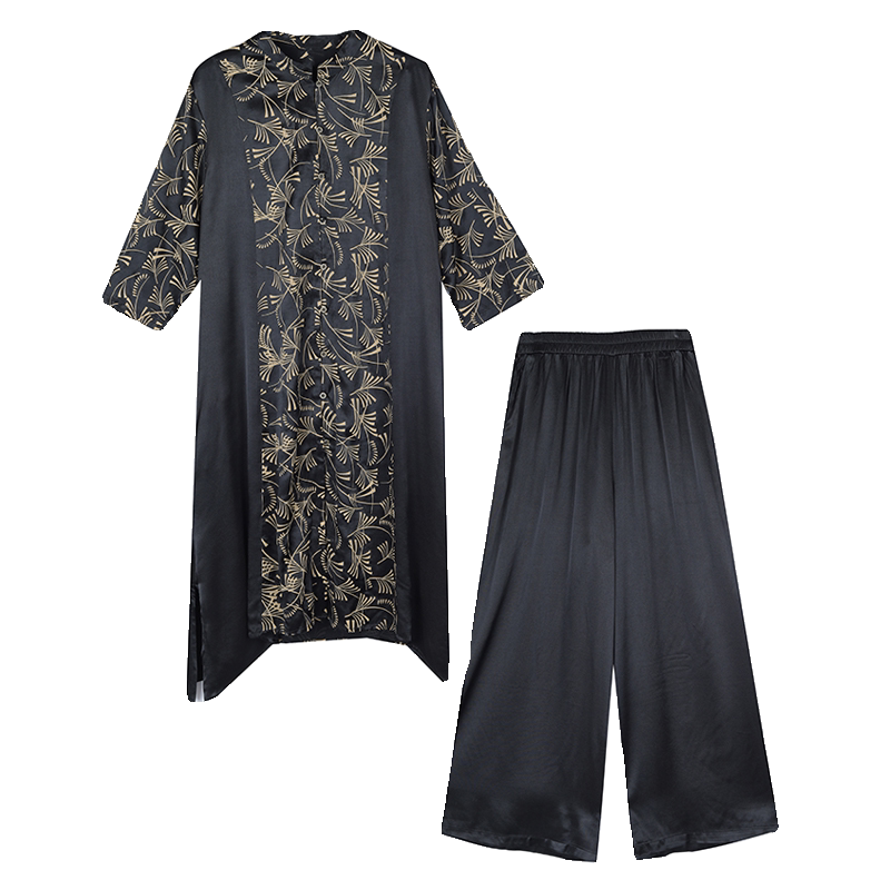 阔太太香云纱套装 洋气印花拼接长款 时尚 两件套春夏新款 衬衫 阔腿裤