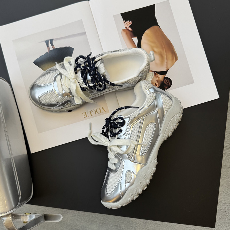 2026春夏新款 银熠 骆驼女鞋 厚底增高银色 休闲网面透气运动老爹鞋