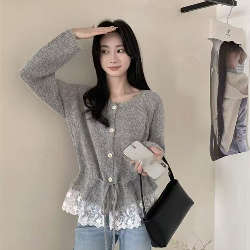 花边针织开衫 外套上衣 甜美拼接娃娃毛衣秋冬新款 蕾丝温柔针织衫