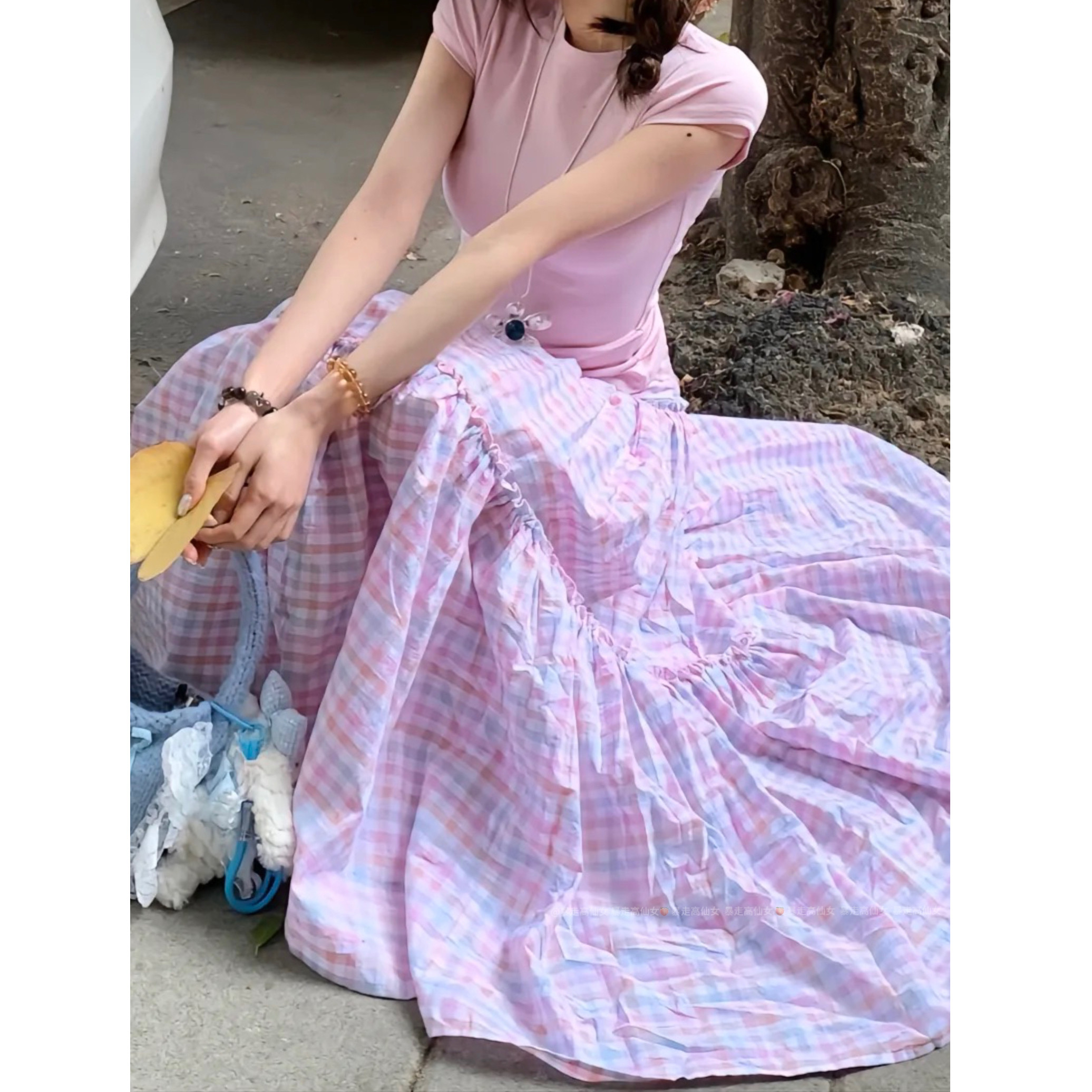 暴走高仙女175高个子加长版 复古花边拼接格纹半身裙女蛋糕裙 美式由