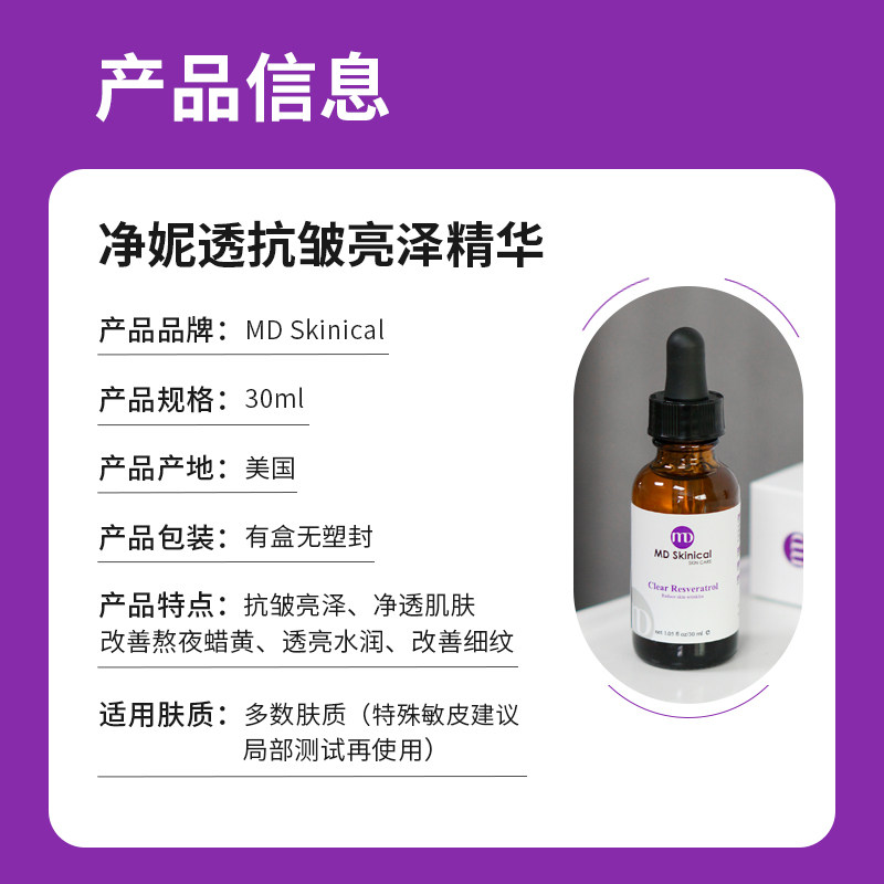为您提供商品MD白藜芦醇胜肽精华净妮透MD 3%提亮抗氧抗皱暗沉30ml Skinical的详细介绍,