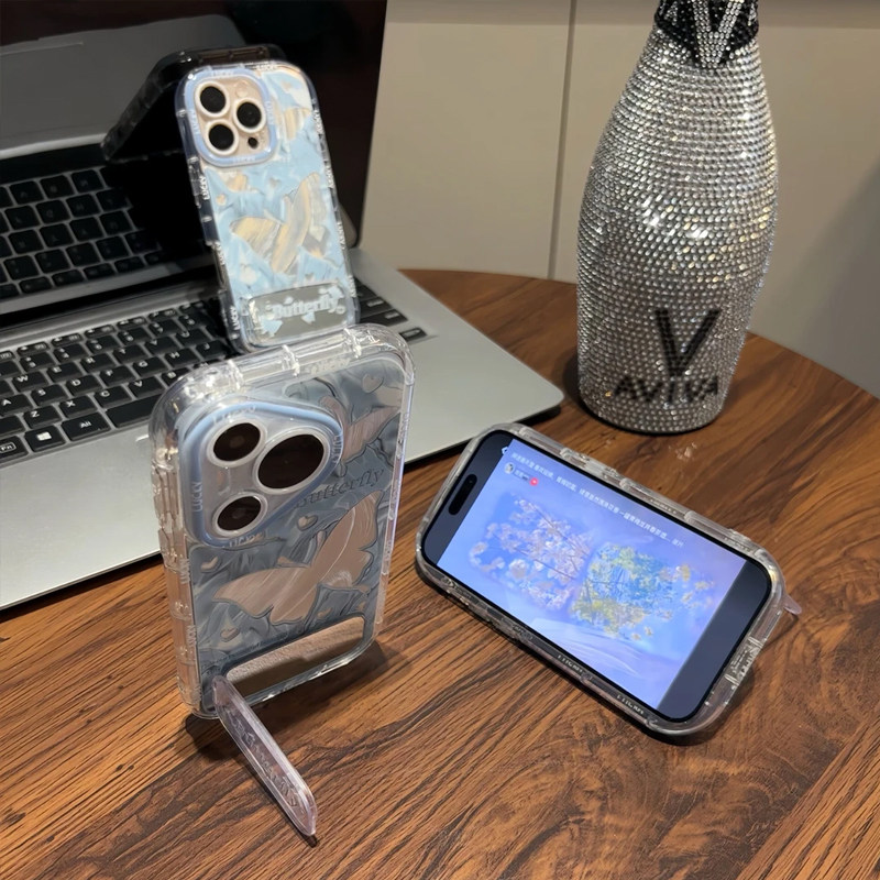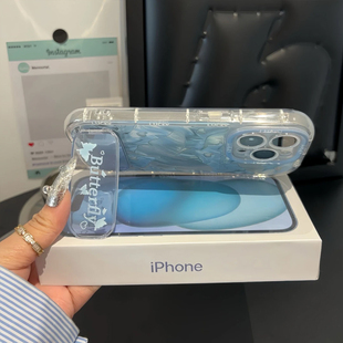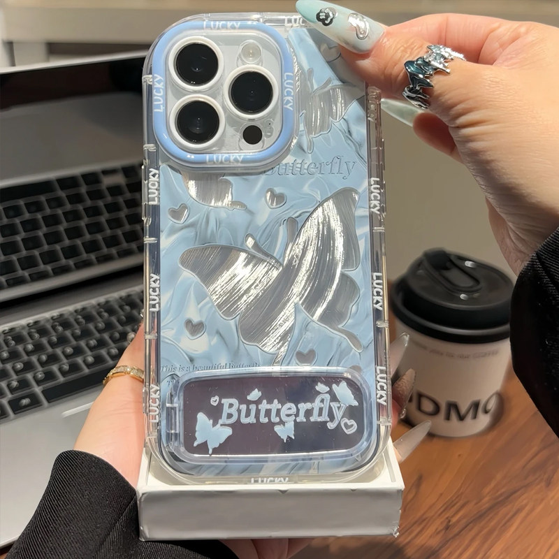 蓝色羽纱蝴蝶镜面支架适用苹果15Pro手机壳iPhone16max小米14华为mate60p70Reno12note11nova13荣耀200k50s19由