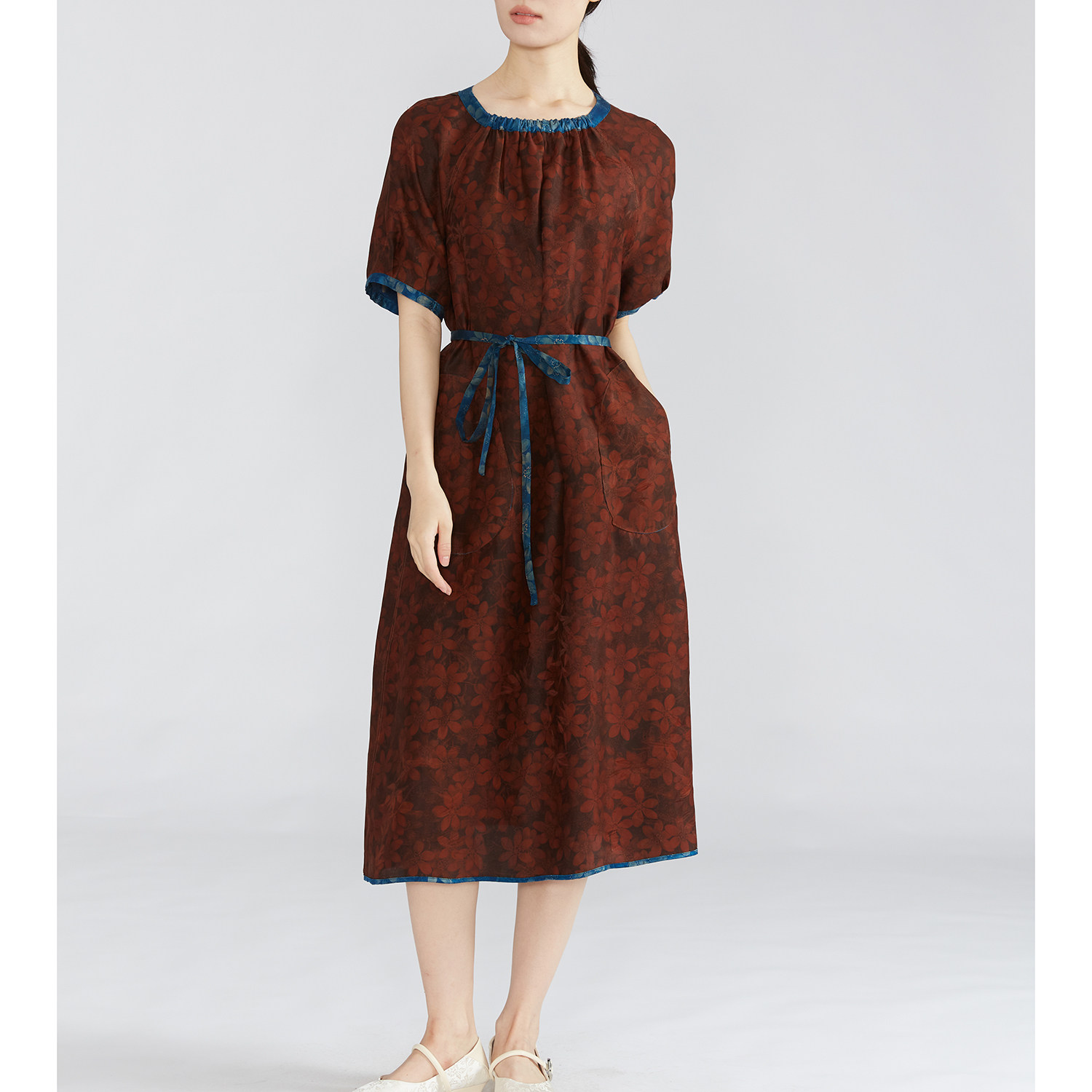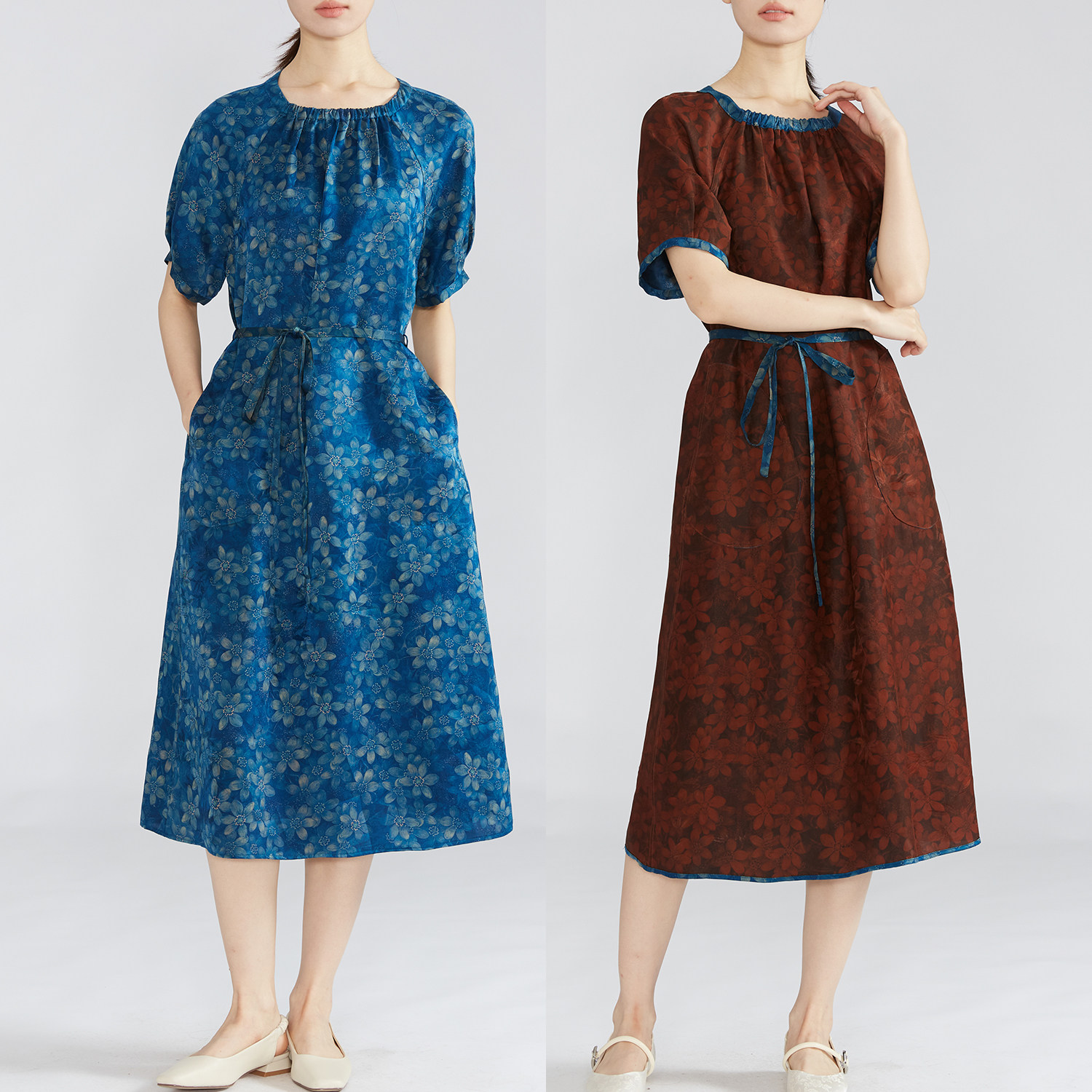 一丝牵 100%桑蚕丝香云纱真丝连衣裙女系带收腰显瘦a字裙 双面穿