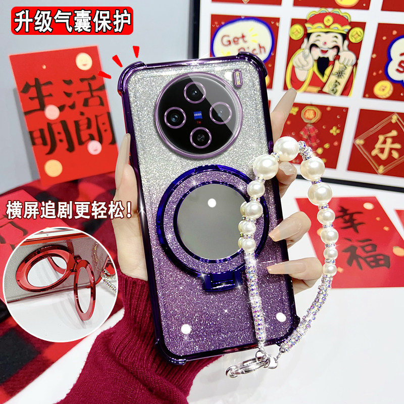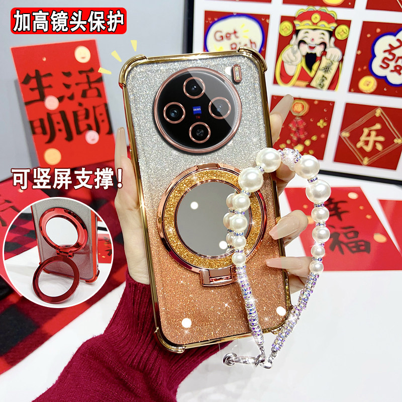 气囊硅胶防摔适用vivoX200手机壳带镜子支架保护套X200Promini曲面屏X100sPro X70挂绳 X90s新年大红X80女新款由
