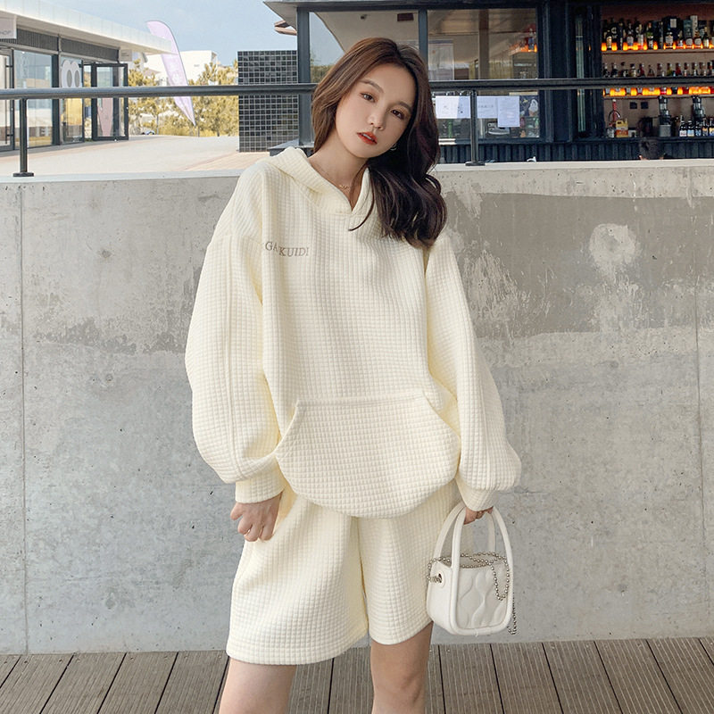 女装 时尚 纯色百搭连帽卫衣短裤 套装 气质两件套 2021早秋新款