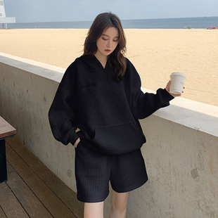 女装 时尚 纯色百搭连帽卫衣短裤 套装 气质两件套 2021早秋新款由
