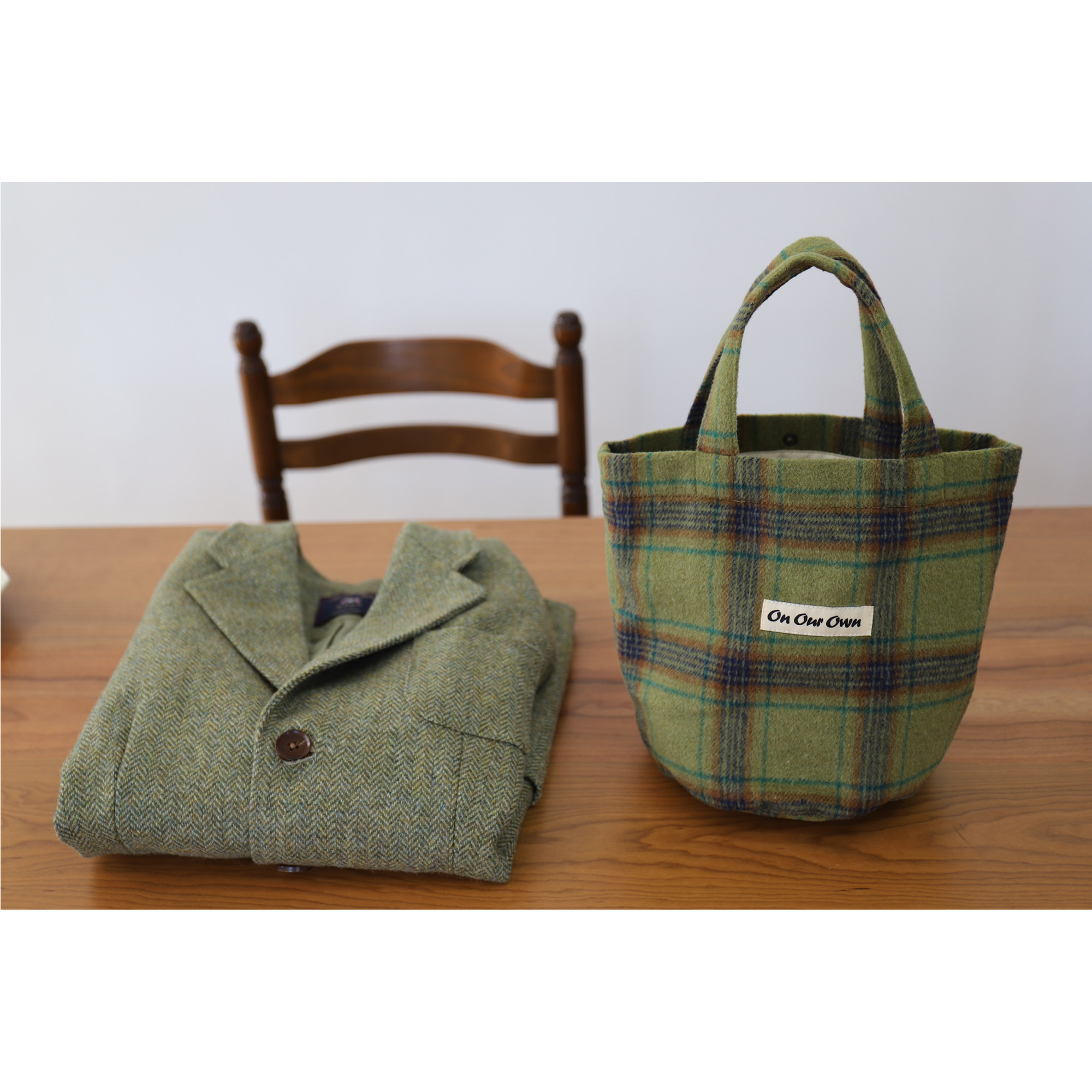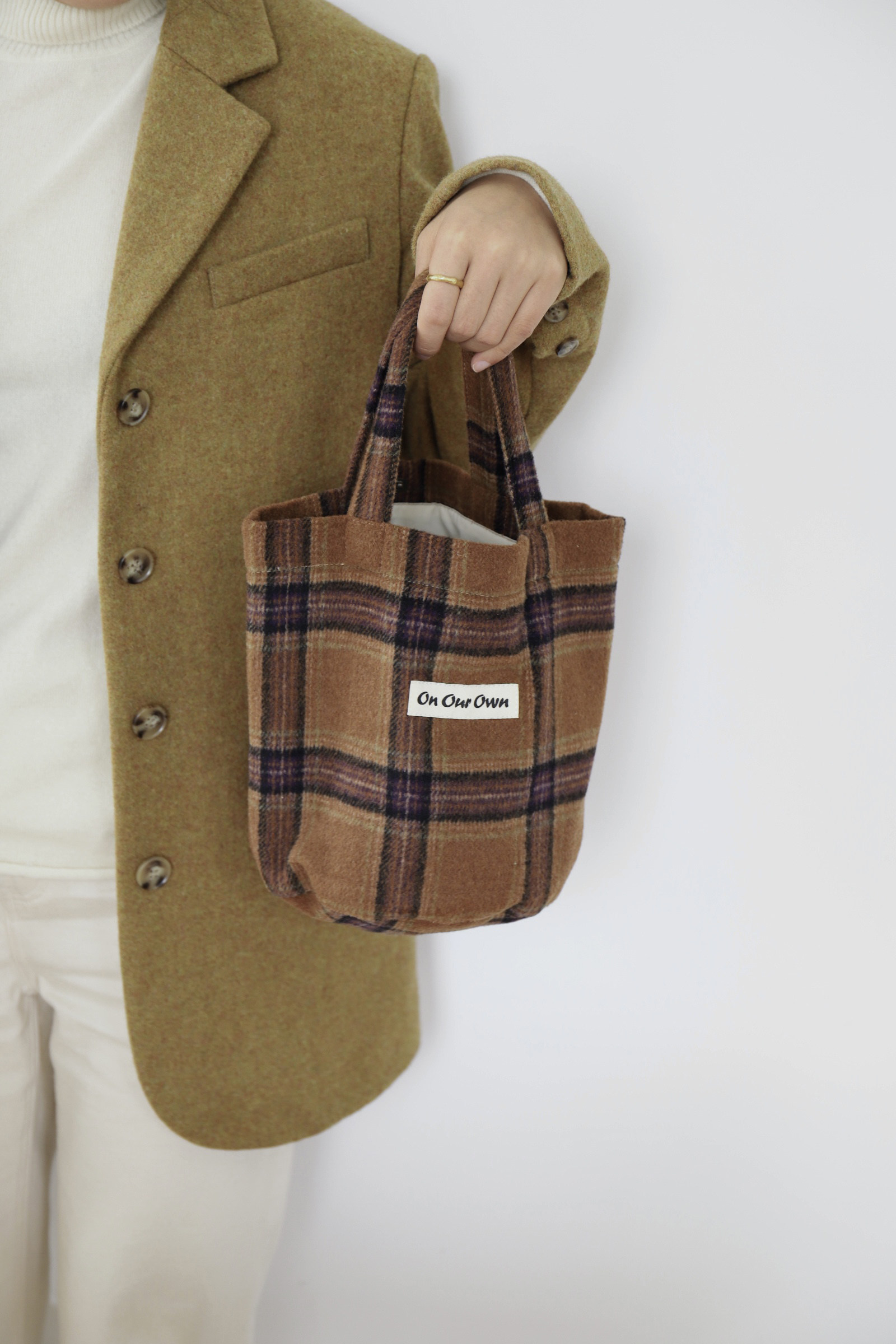 咸菜绿 茶褐棕圆底羊毛格子手拎包袋水桶包 原创 21FW Our Own由