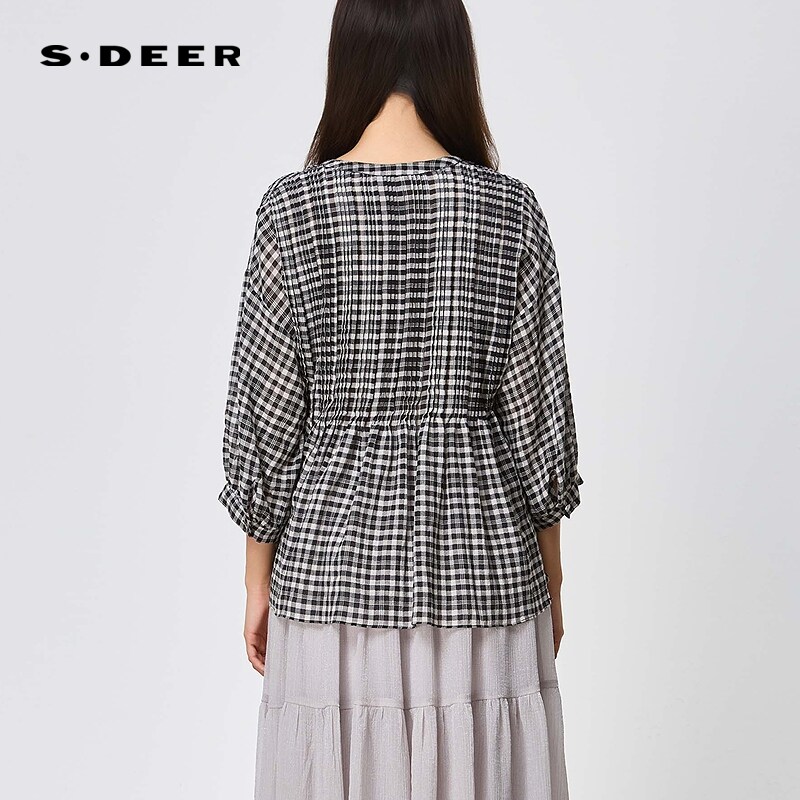 sdeer圣迪奥女装 清新V领棋盘格长袖 衬衫 上衣S252Z3216 夏季