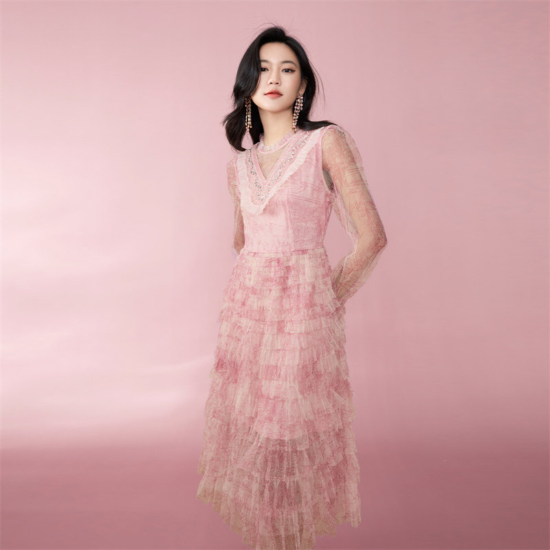 直播 新款 挂脖长袖 杏色蕾丝连衣裙显瘦短裙 春装