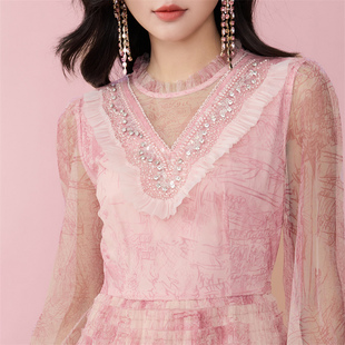 RECIT 领无袖 连衣裙女春夏千金风蓬蓬修身 收腰背心裙 玫瑰油画衬衫