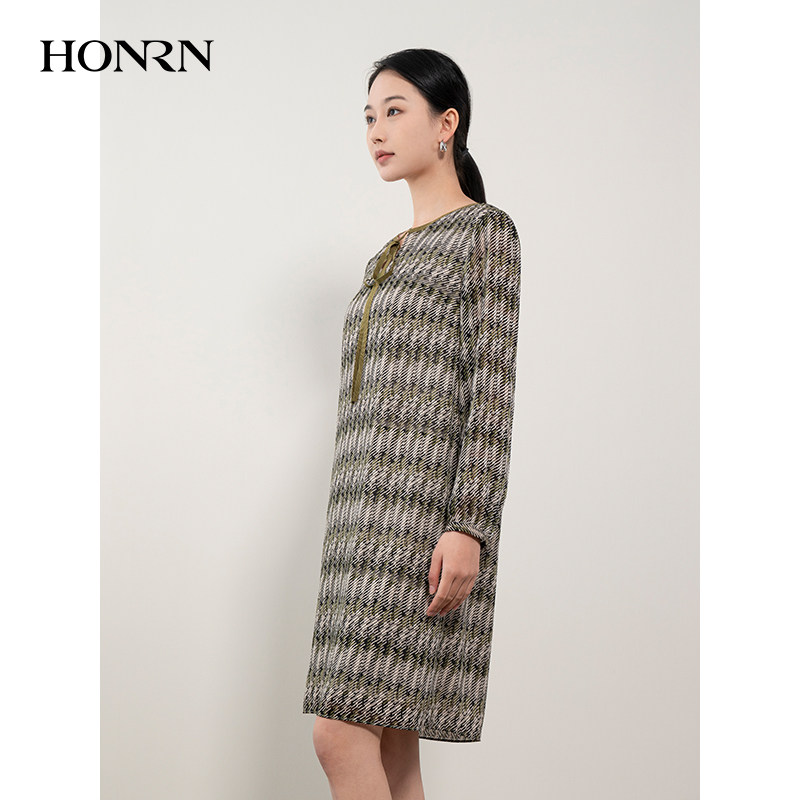 HONRN 显瘦连衣裙女春秋HH11OL097 红人宽松小众设计感印花v领长袖