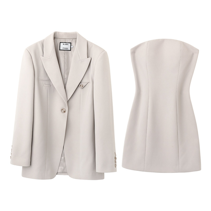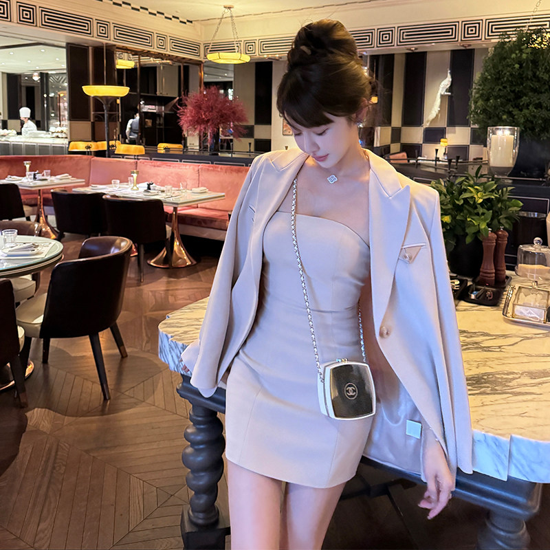 韩雨嘉早春气质名媛高级感粉色西装 外套收腰性感抹胸连衣裙套装由