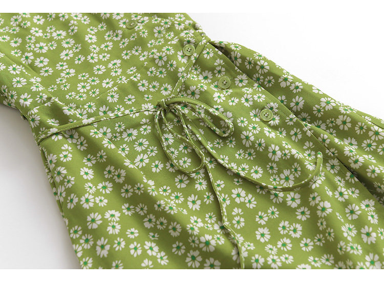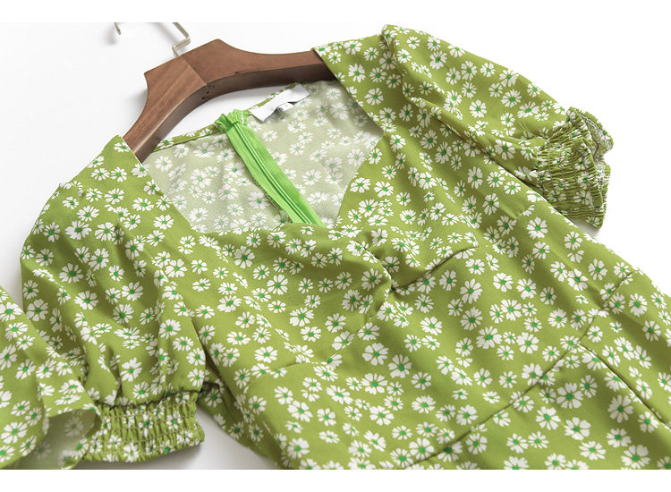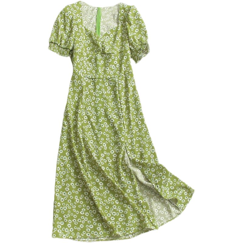 新款 O161碎花高腰修身 V领泡泡袖 夏季 雪纺裙女长裙连衣裙 2022短袖