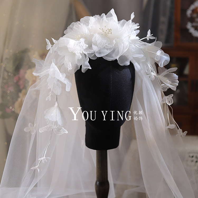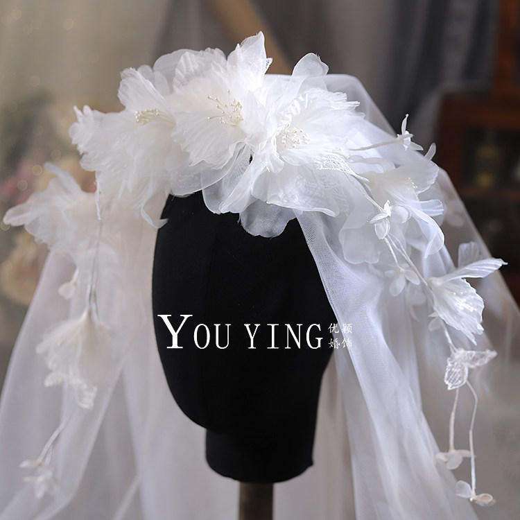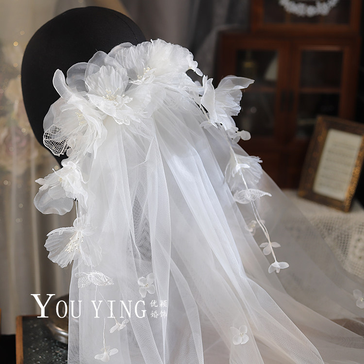 V374超仙手工蝴蝶结新娘头纱双层白色领证登记头饰求婚礼拍照道具
