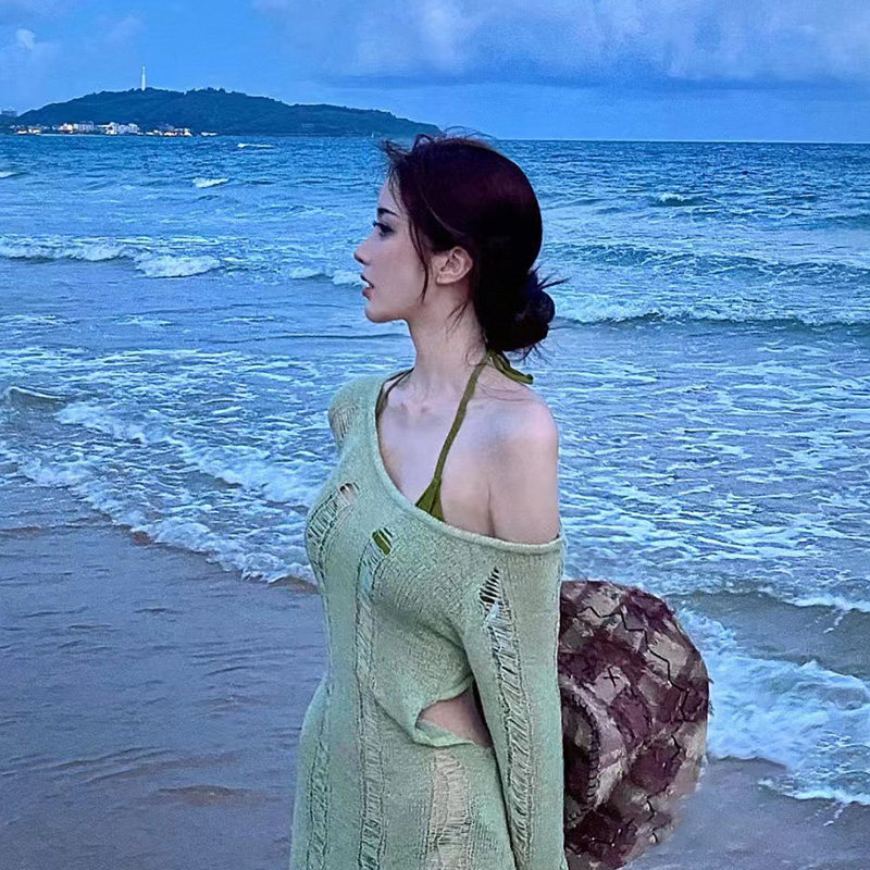 防晒罩衫 小胸聚拢大露背 绿色针织破洞比基尼长袖 泳衣女INS风法式