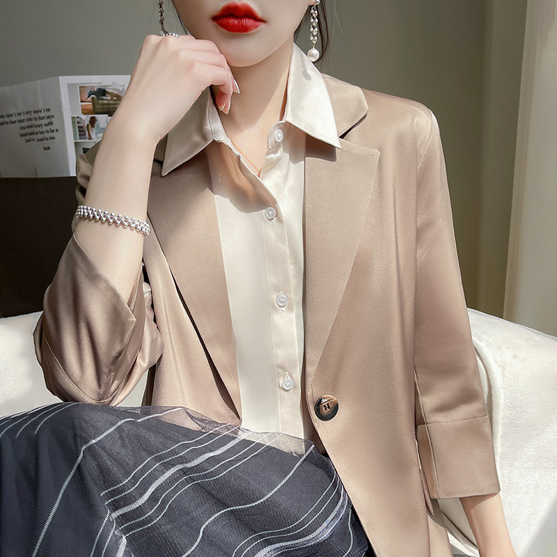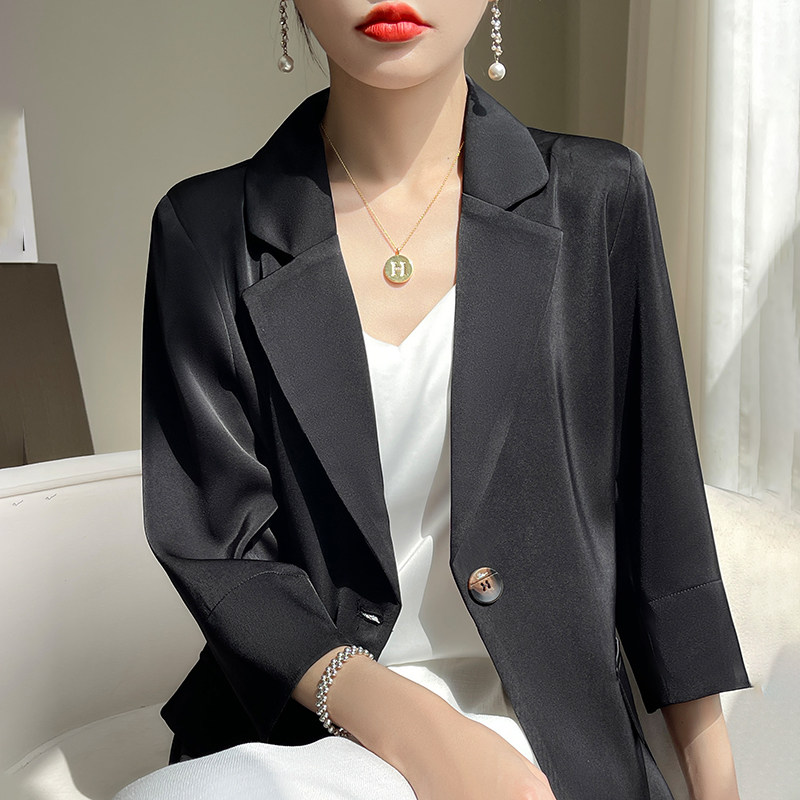 缎面黑色七分袖 醋酸白色西装 外套女高级感休闲薄款 夏季 小西服套装