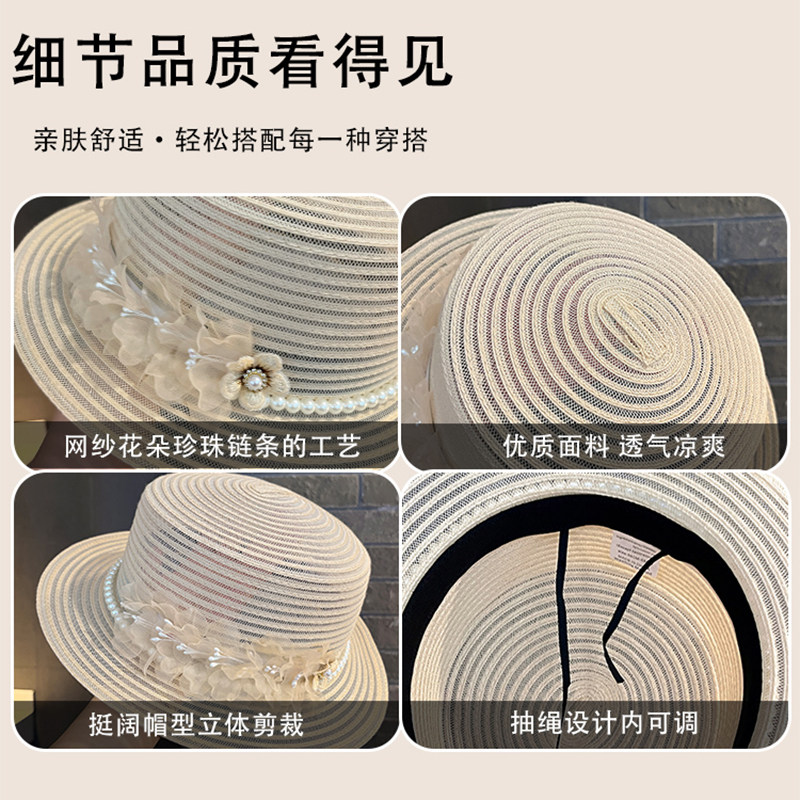 为您提供商品法式 海边度假太阳帽户外防晒遮阳帽子 网纱珍珠花朵平顶礼帽女夏季的详细介绍,