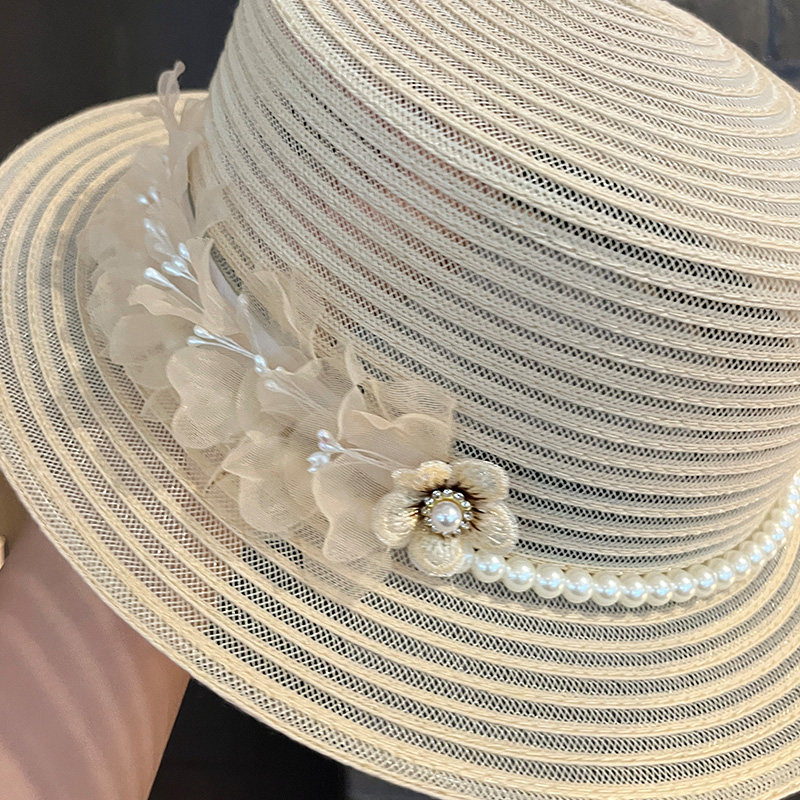 法式 海边度假太阳帽户外防晒遮阳帽子 网纱珍珠花朵平顶礼帽女夏季