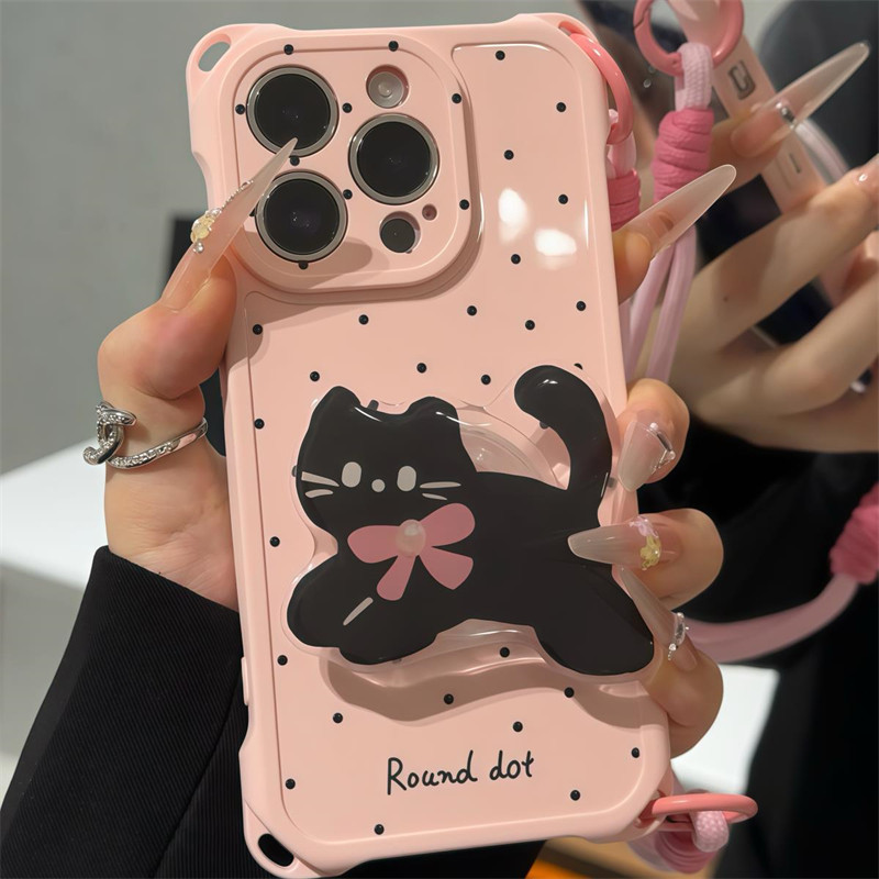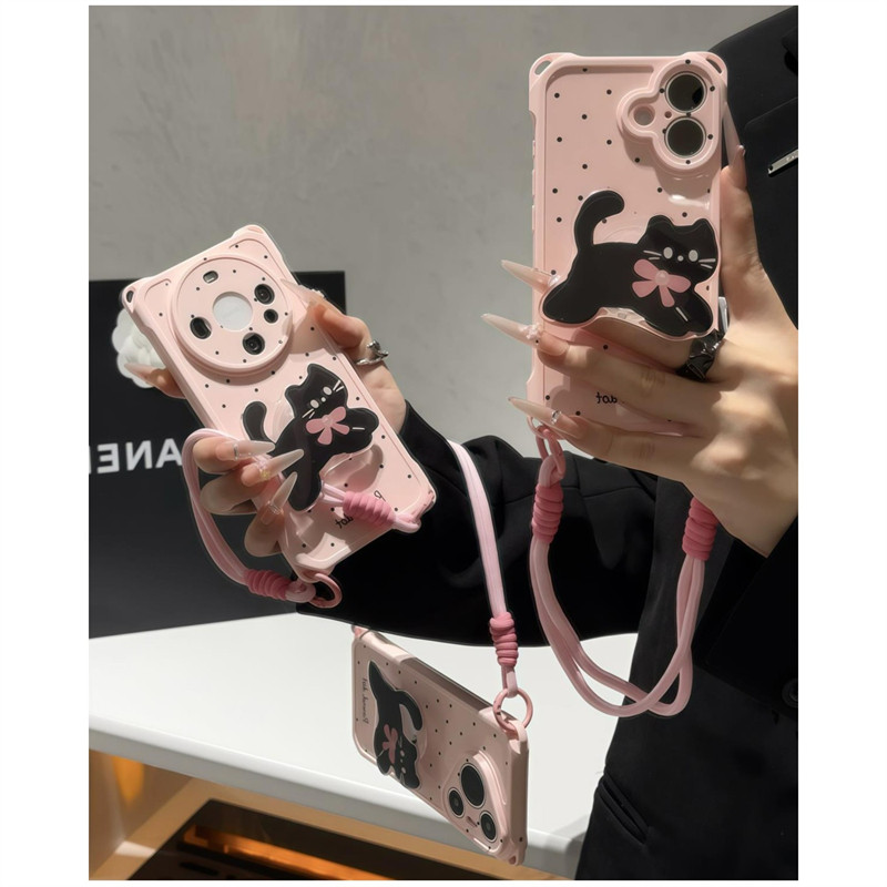 iphone17promax华为mate70荣耀vivo小米15红米k80oppo真我GT 波点粉蝴蝶结小黑猫支架适用苹果16pro手机壳新款由