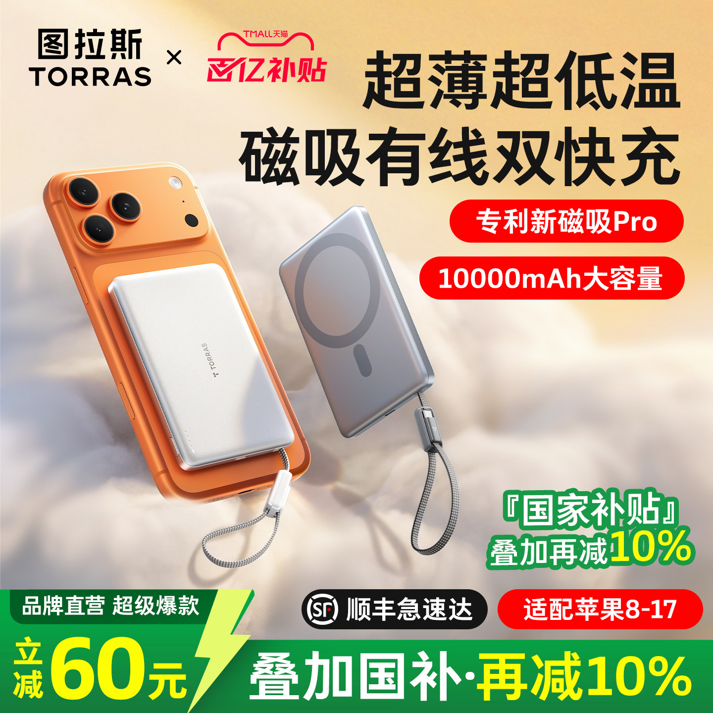 图拉斯磁吸充电宝2026新款 小米 自带线适用苹果17无线超薄便携3C认证可上飞机快充大容量专用移动电源官方正品