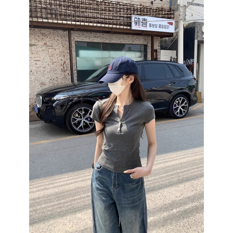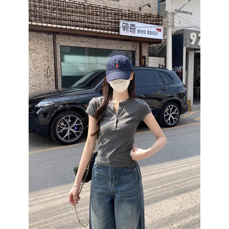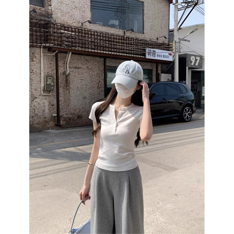 白色半开领纽扣正肩短袖 设计感修身 短款 小个子纯棉上衣 t恤女夏季