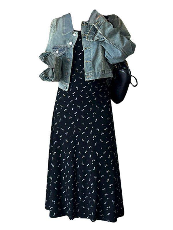 收腰气质碎花连衣裙女两件套装 胖妹妹韩系巨显瘦牛仔外套春季 大码
