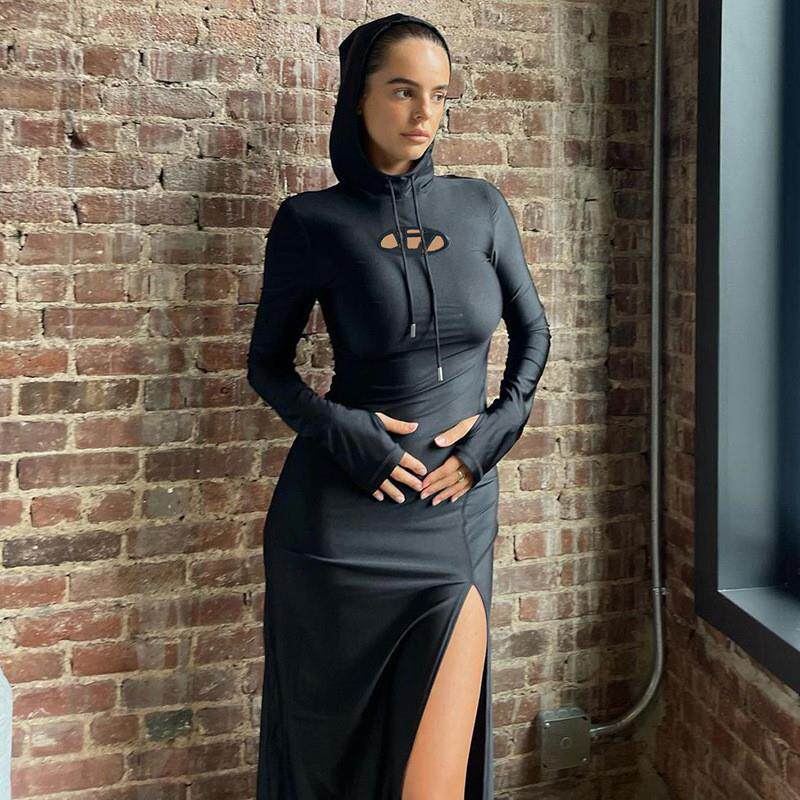 性感开衩高腰修身 跨境欧美亚马逊2023秋季 女装 新款 连衣裙 连帽长款由