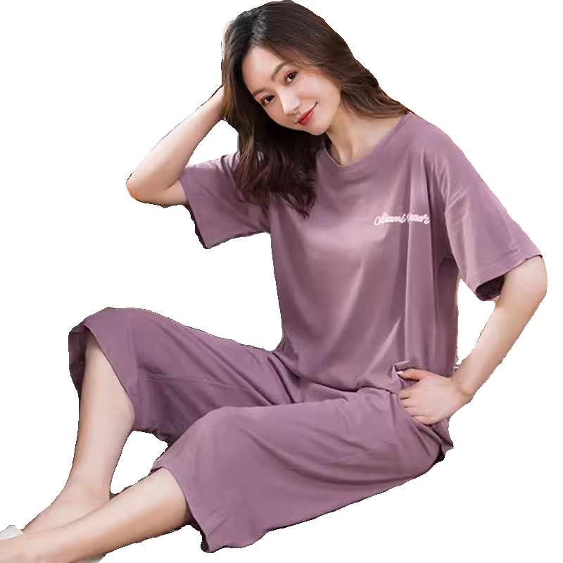 女士可外穿一体带胸垫薄款 女士睡衣夏季 短袖 七分裤 纯棉家居服套装