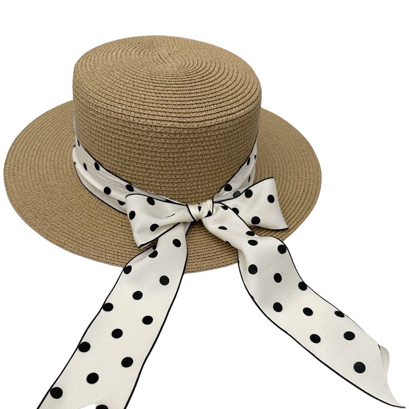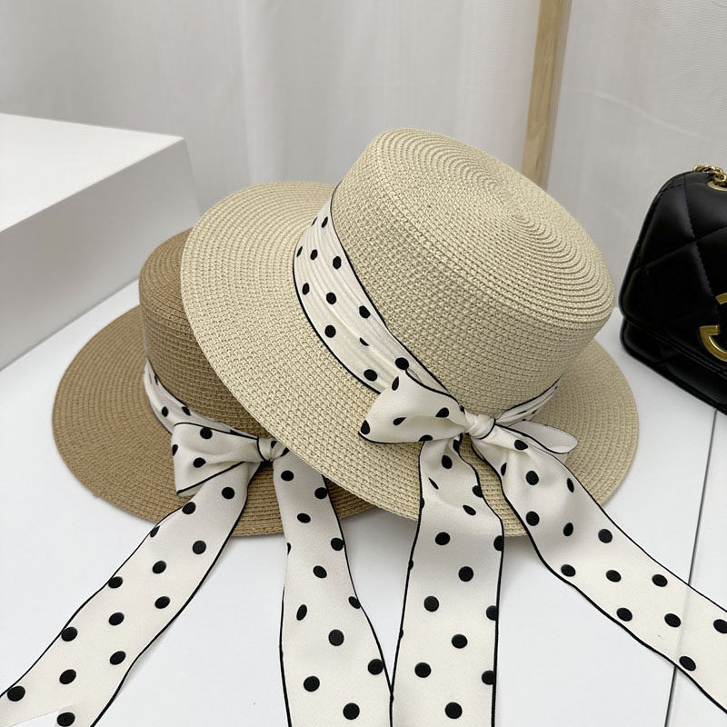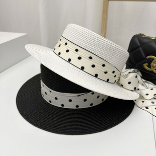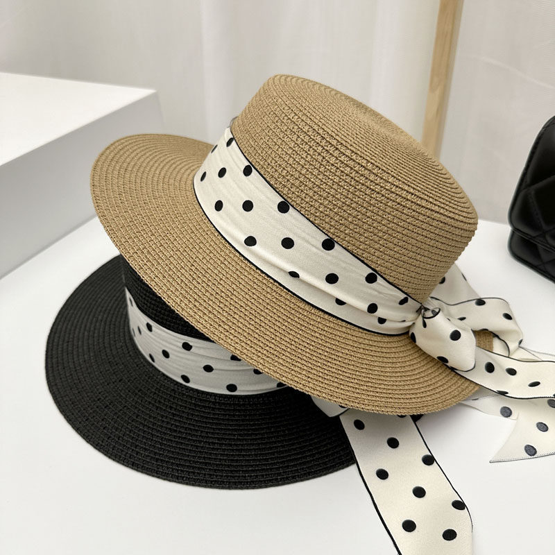 新款 遮阳帽韩国波点长飘带平顶帽海边沙滩度假防晒太阳帽 草帽夏季由