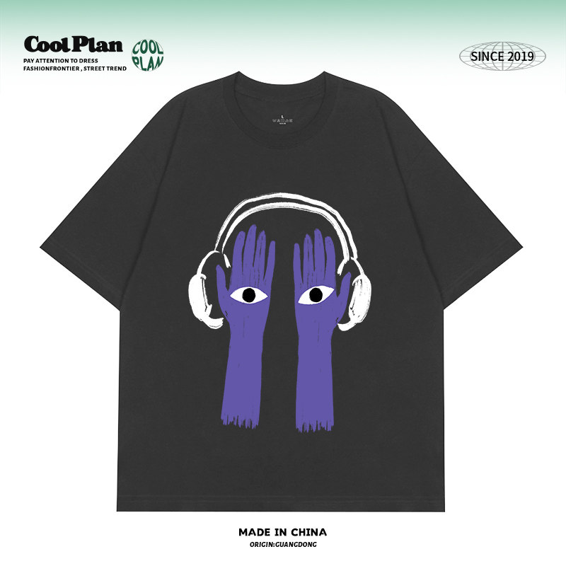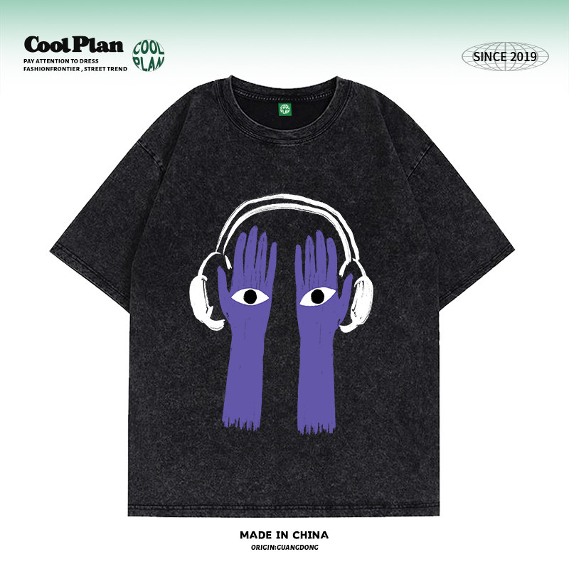 男女中性BF宽松潮拍重磅短袖 体恤 小众复古耳机i人水洗t恤夏 美式由