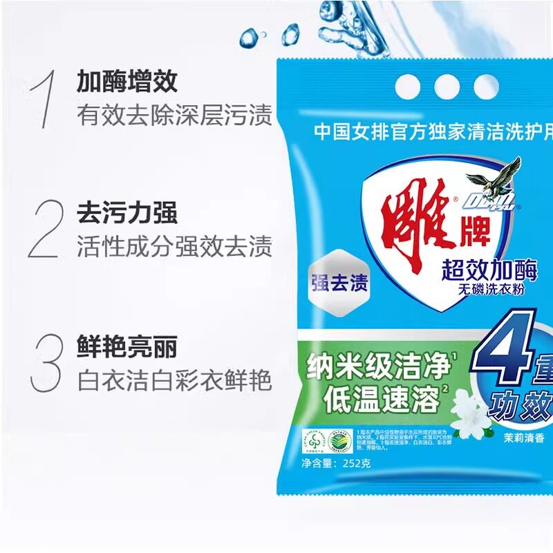 为您提供商品2袋深层去渍衣物清洁洗衣粉无磷茉莉香 雕牌超效加酶洗衣粉252g的详细介绍,