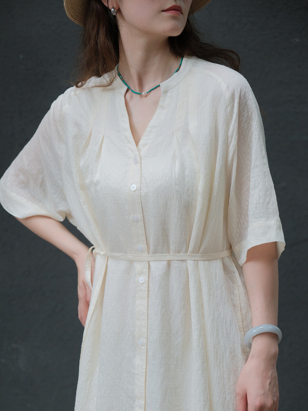 连衣裙配腰带桑蚕丝棉内衬LF3821限量 远家亚麻天丝立V领连肩袖由