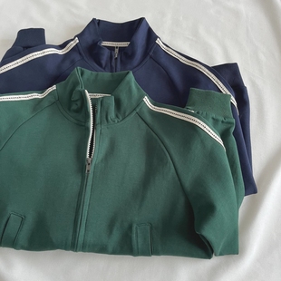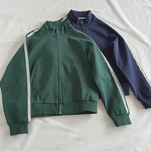 深蓝色 秋新款 宽松百搭开衫 卫衣女 墨绿色立领拉链短外套由