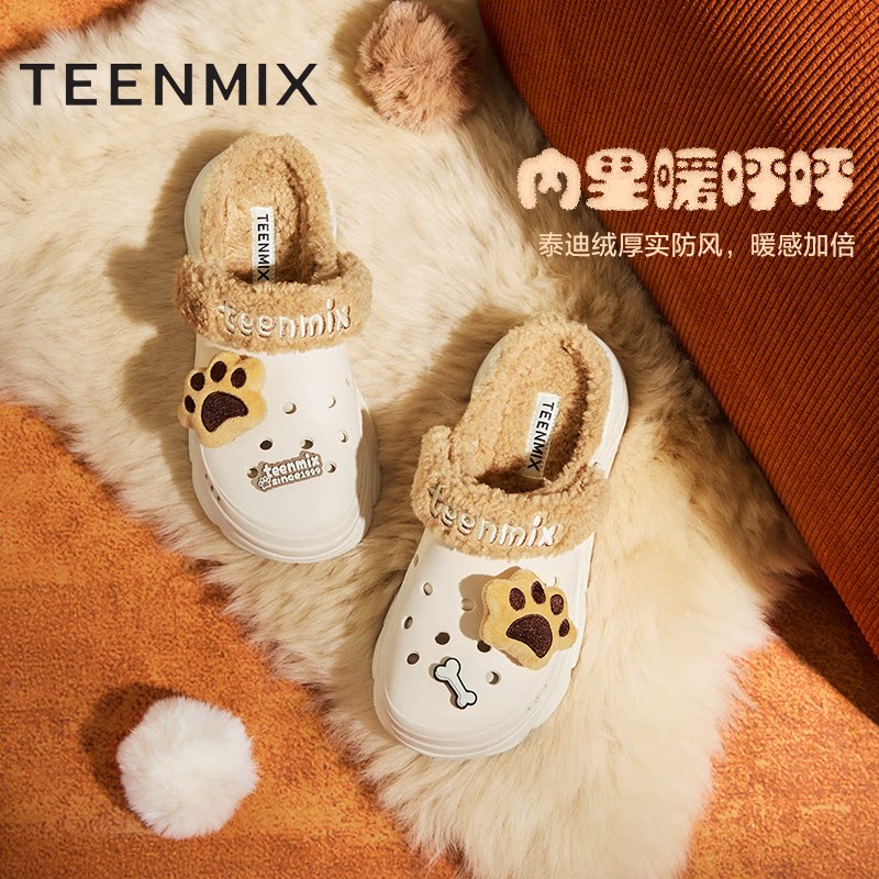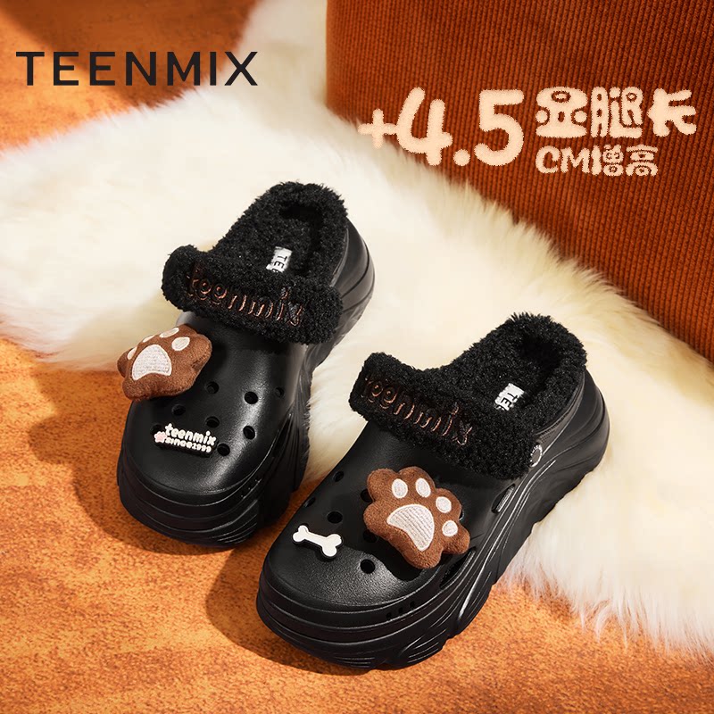 厚底雪地靴冬季 天美意外穿加绒洞洞鞋 毛毛鞋 女户外棉拖鞋 新款由
