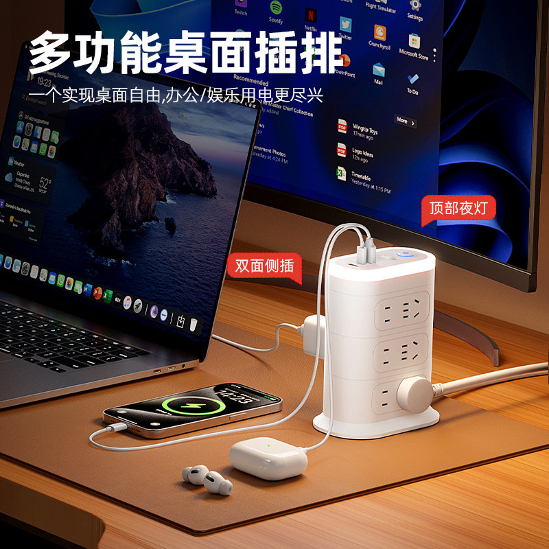 立式 插座多功能面板多孔USB快充20W插排插拖线板夜灯 官方正品