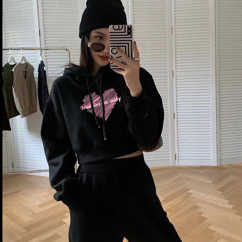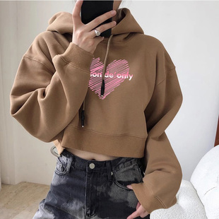 爱心印花时尚 one more森女系可爱秋季 新品 卫衣潮 落肩舒适连帽女式由