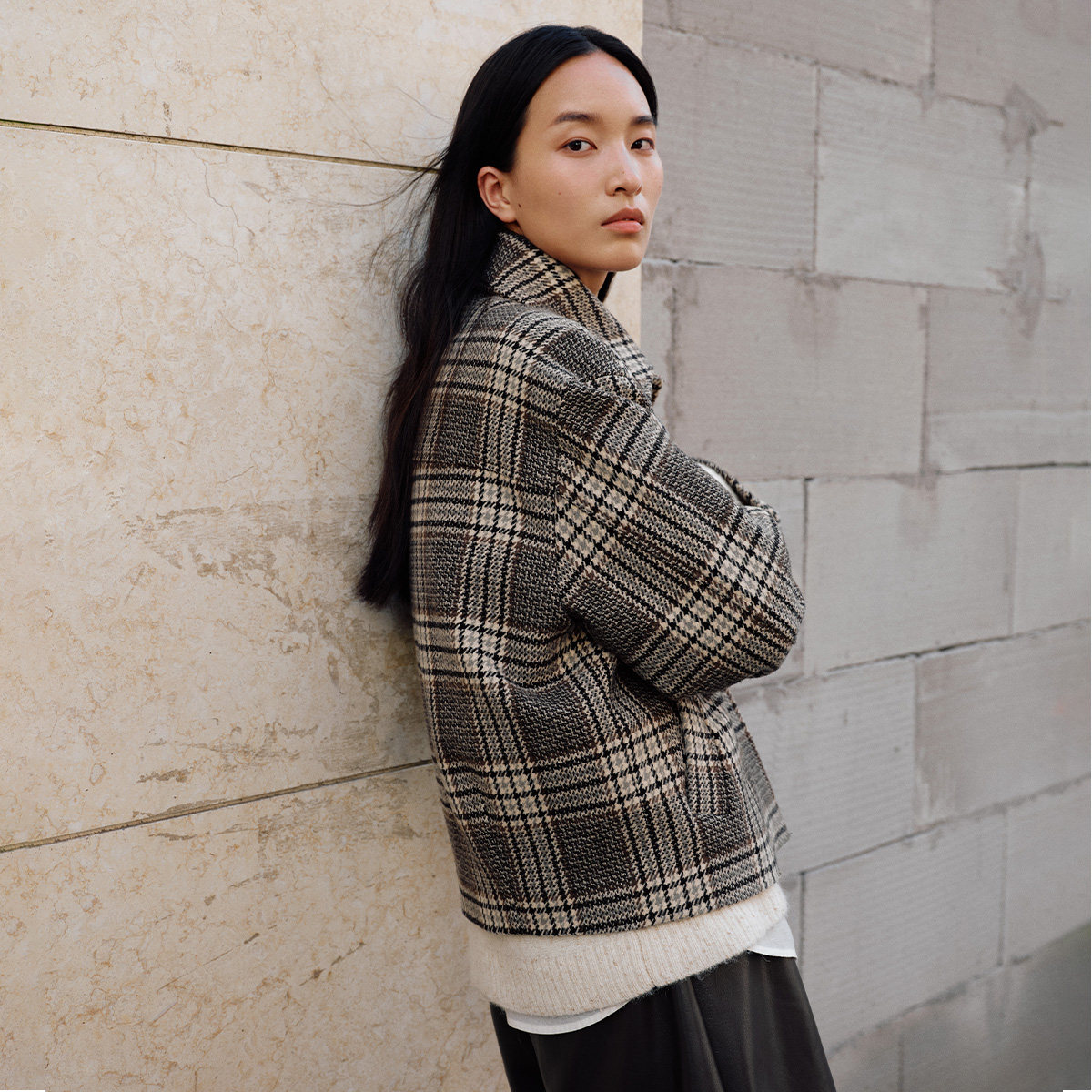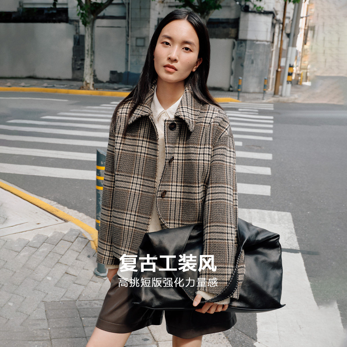 播倪妮同款 商场同款 复古格纹24冬毛呢短外套女BDR4WD3743 羊毛由