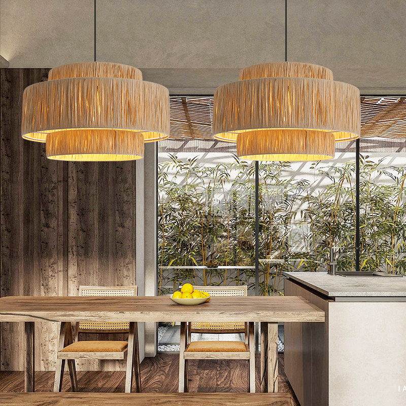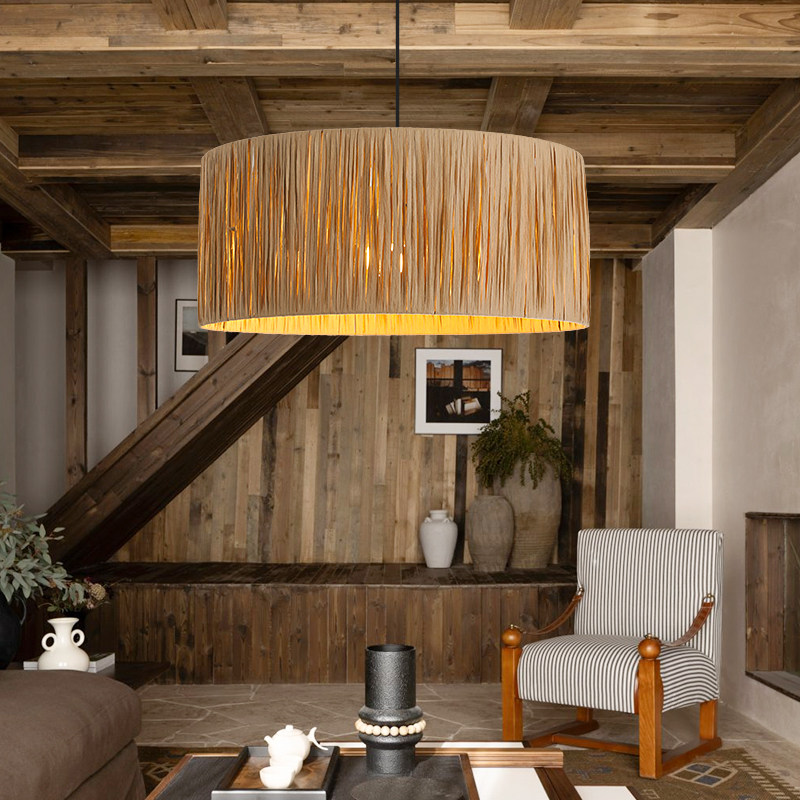 藤艺侘寂风卧室灯饰 餐厅吊灯复古拉菲草编手工编织客栈民宿灯日式