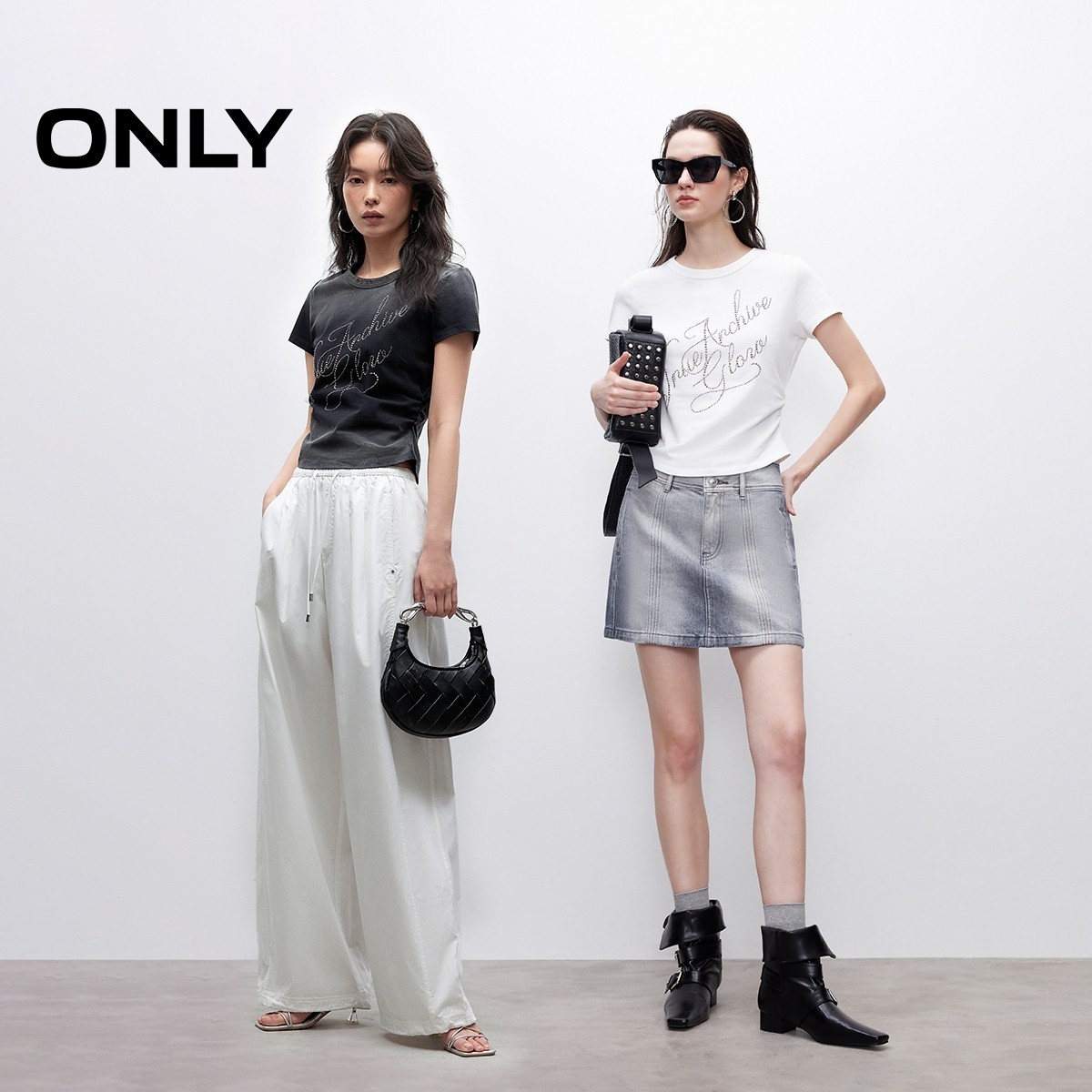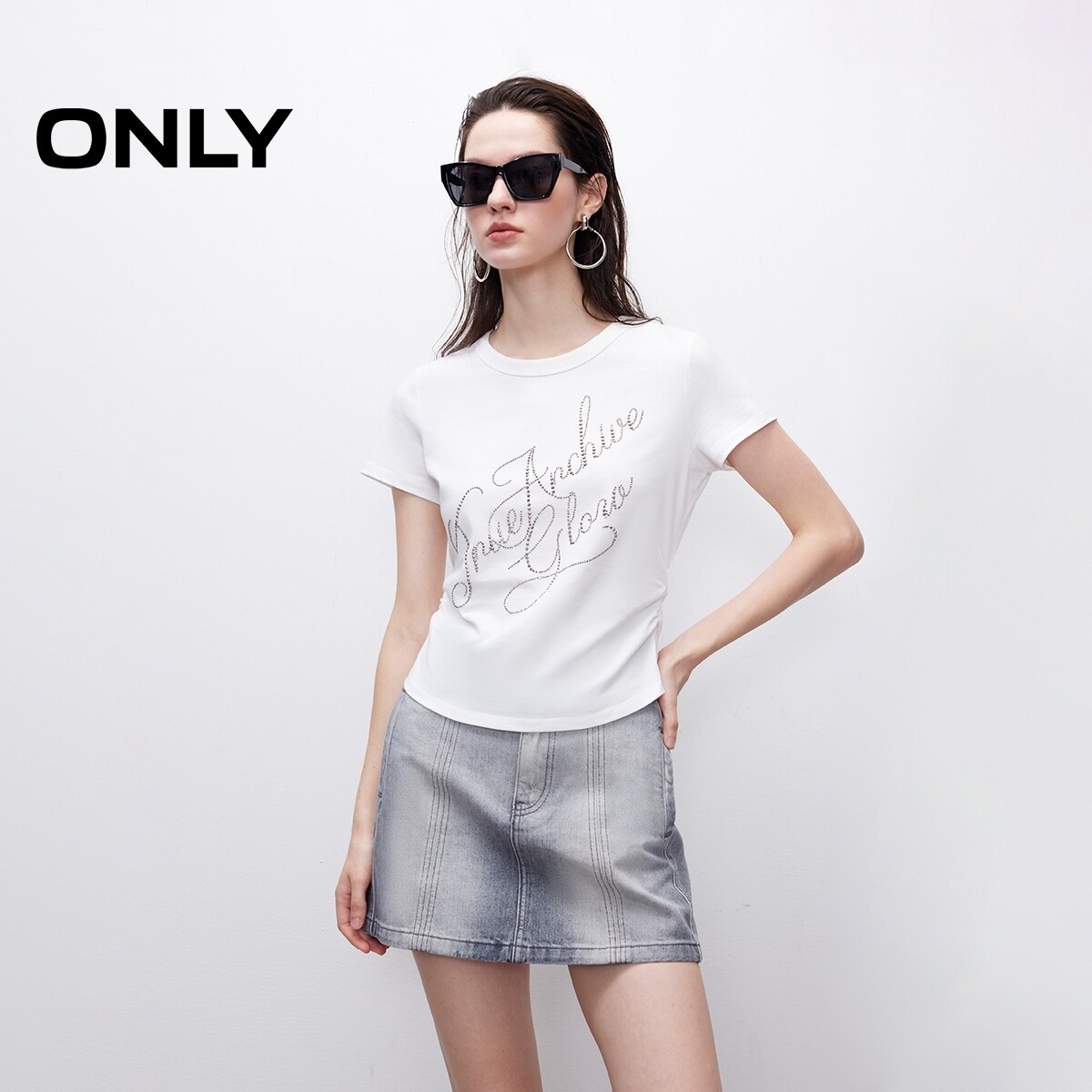 春夏款 渐变水洗吸睛水钻贴字显瘦抽褶纯棉短袖 T恤女 ONLY奥莱由