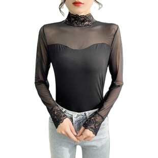 长袖 蕾丝打底衫 百搭镂空小衫 半高领修身 立领内搭上衣2020秋装 薄款