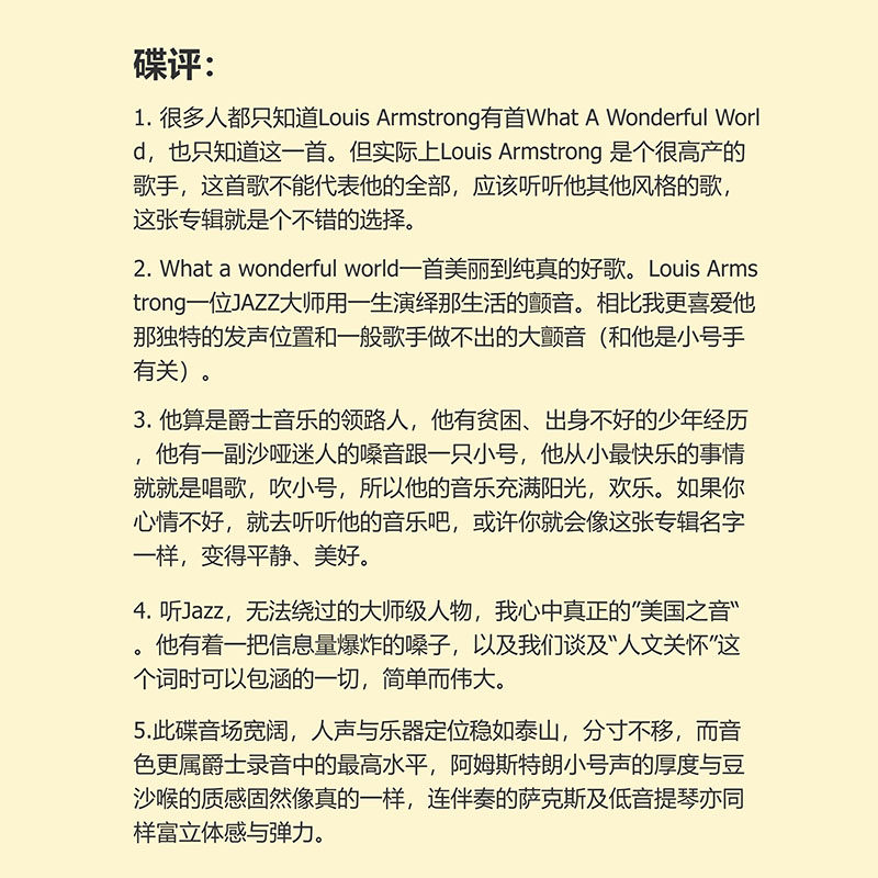 为您提供商品原版 爵士音乐发烧天碟 进口碟片 阿姆斯特朗 Louis Armstrong的详细介绍,