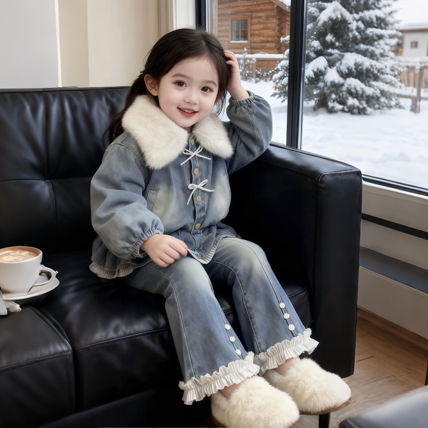 加厚保暖洋气百搭外套女孩修身 女童冬季 牛仔套装 新款 两件套 喇叭裤