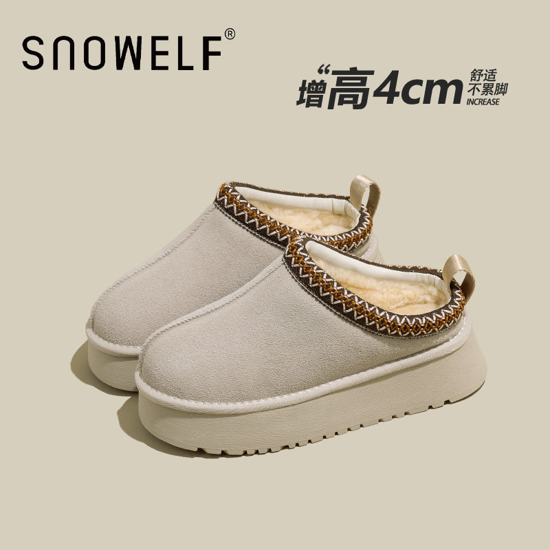 真皮厚底包头拖鞋 新款 民族风一脚蹬加绒棉鞋 雪地靴增高女2024冬季由