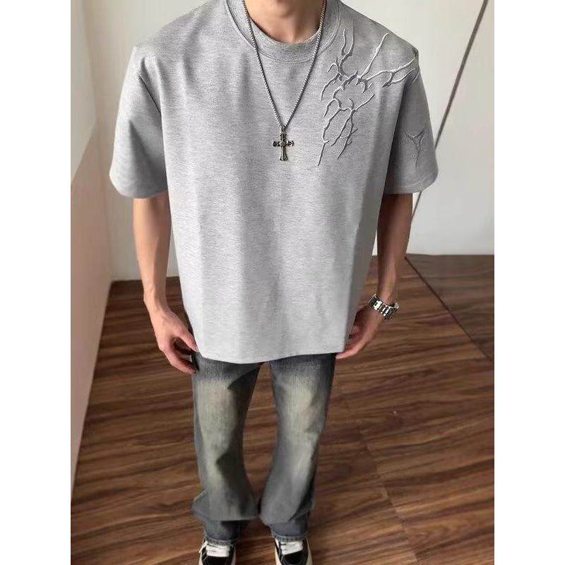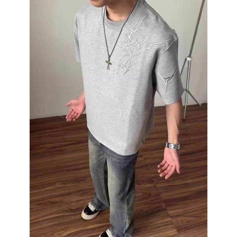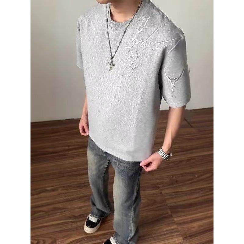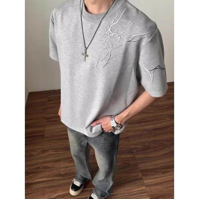 重磅正肩t恤设计感潮牌美式 闪电刺绣短袖 男款 夏季 高街五分袖
