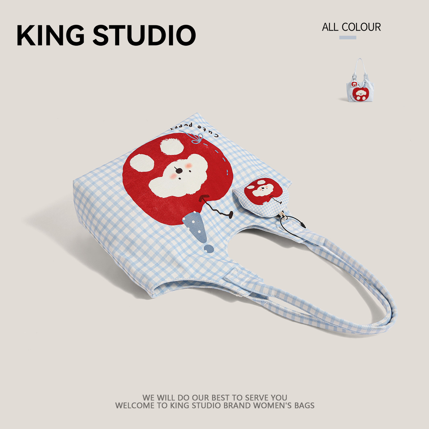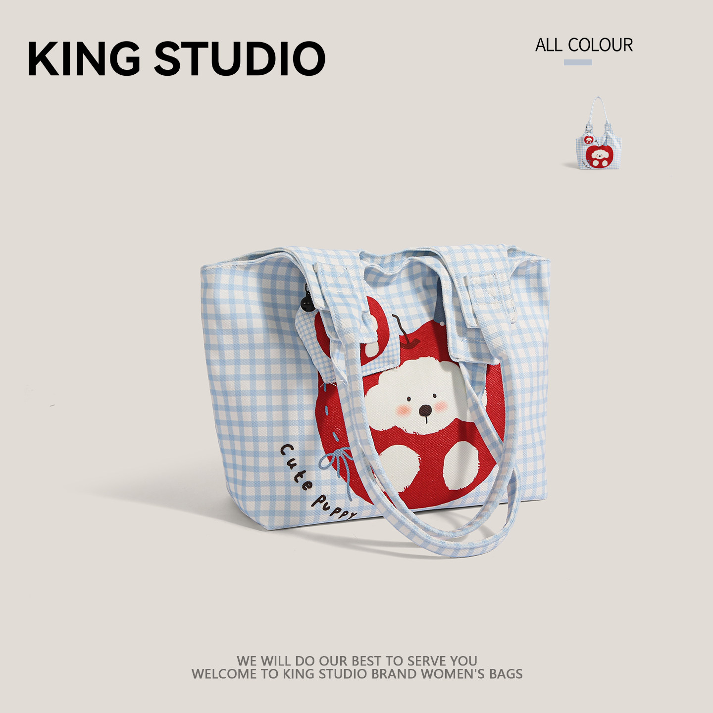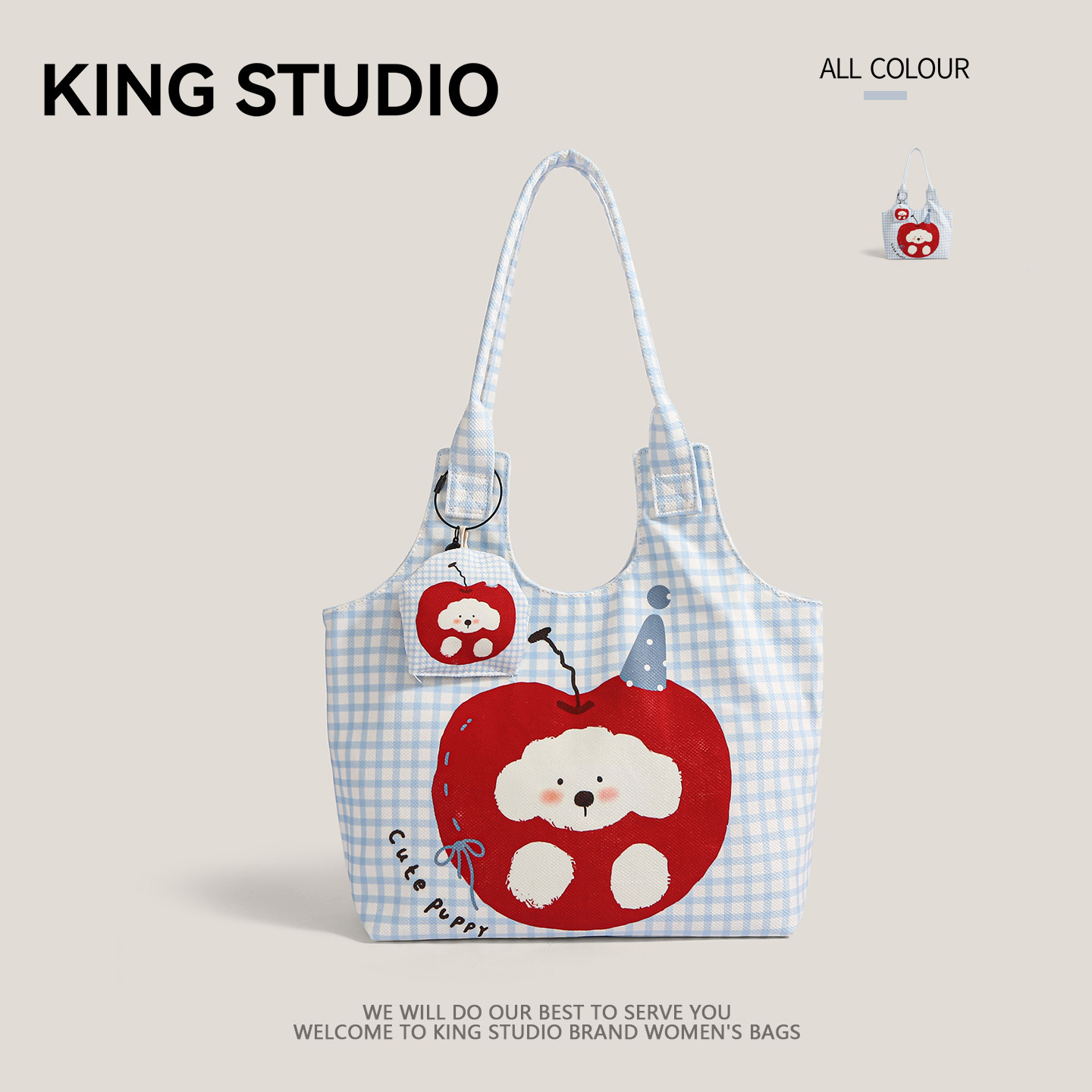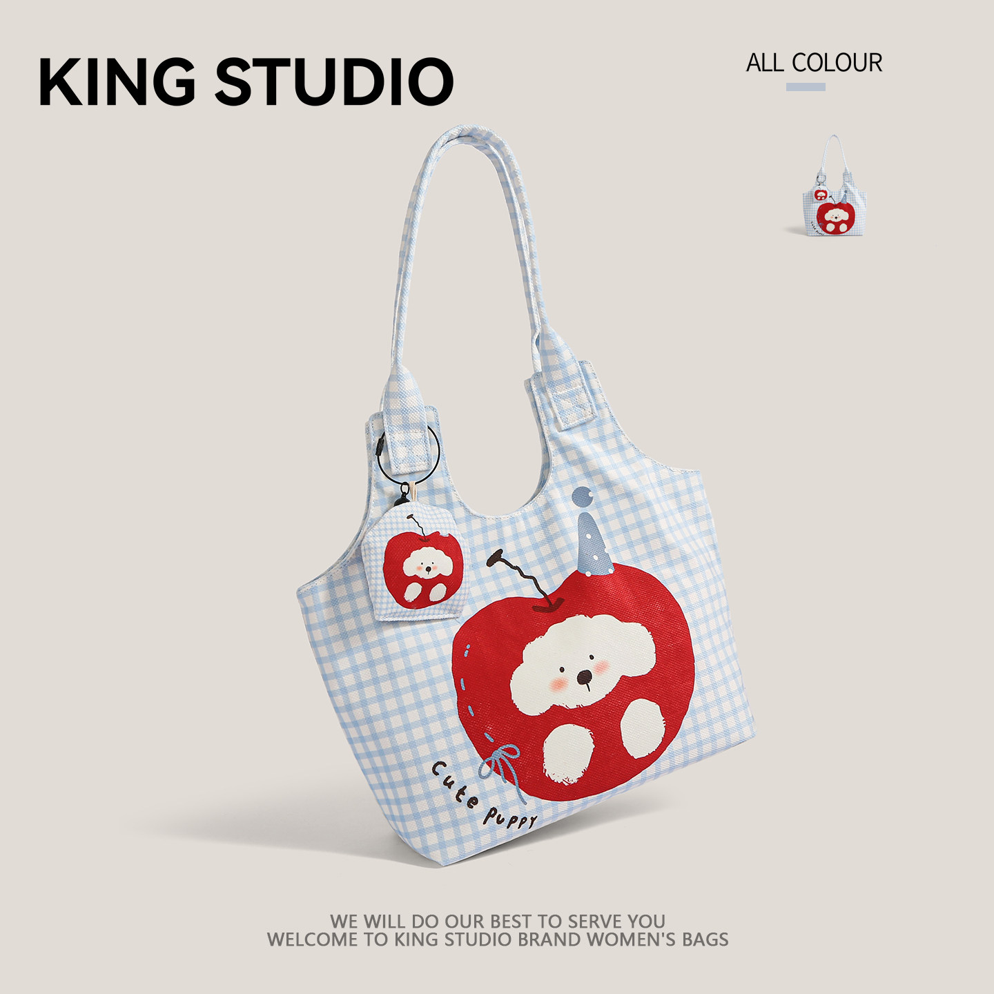 大容量学生上课通勤单肩托特包 可爱格子苹果小狗帆布包女2026新款