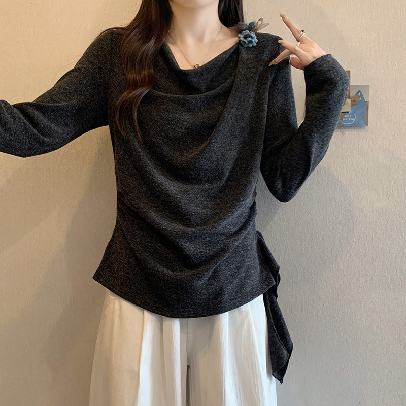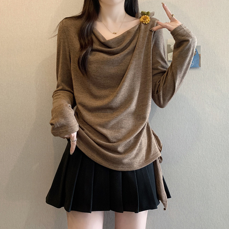 法式 大码 胖mm遮肚子显瘦设计感正肩长袖 t恤 不规则荡领上衣女春装
