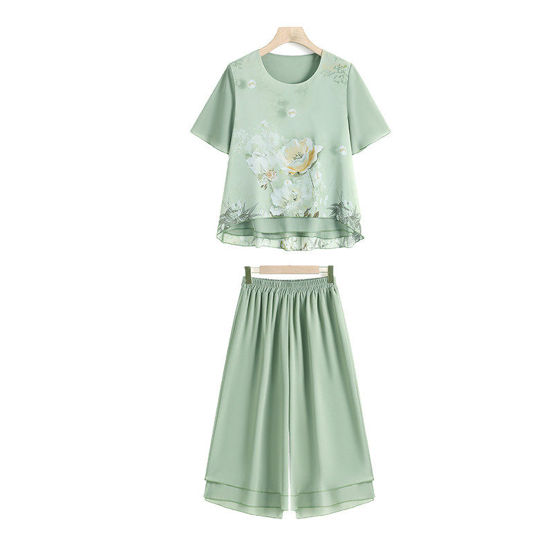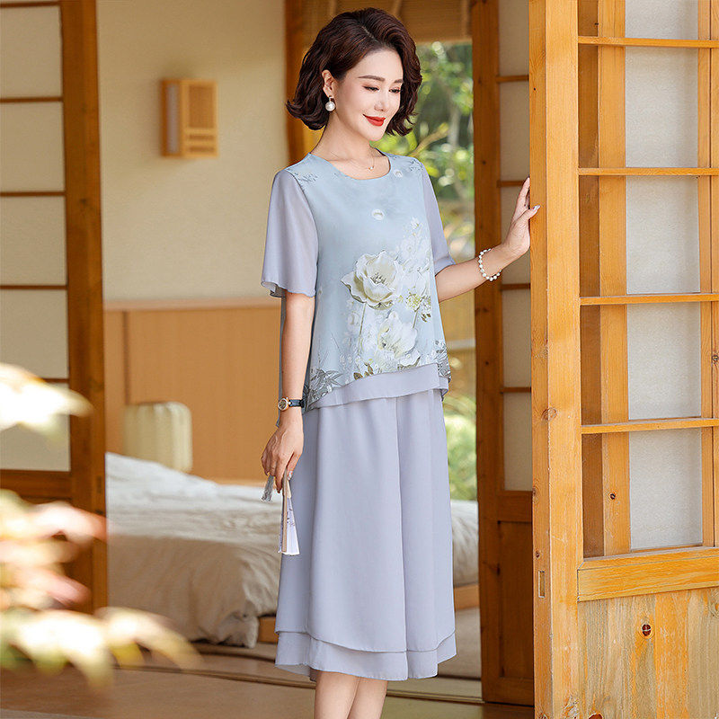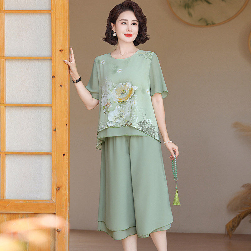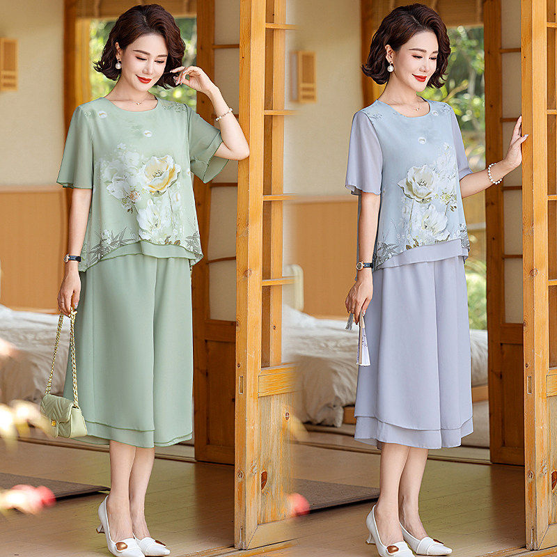妈妈装 裤 两件套装 T恤上衣 时尚 短袖 中老年人女装 洋气雪纺衫 子夏季