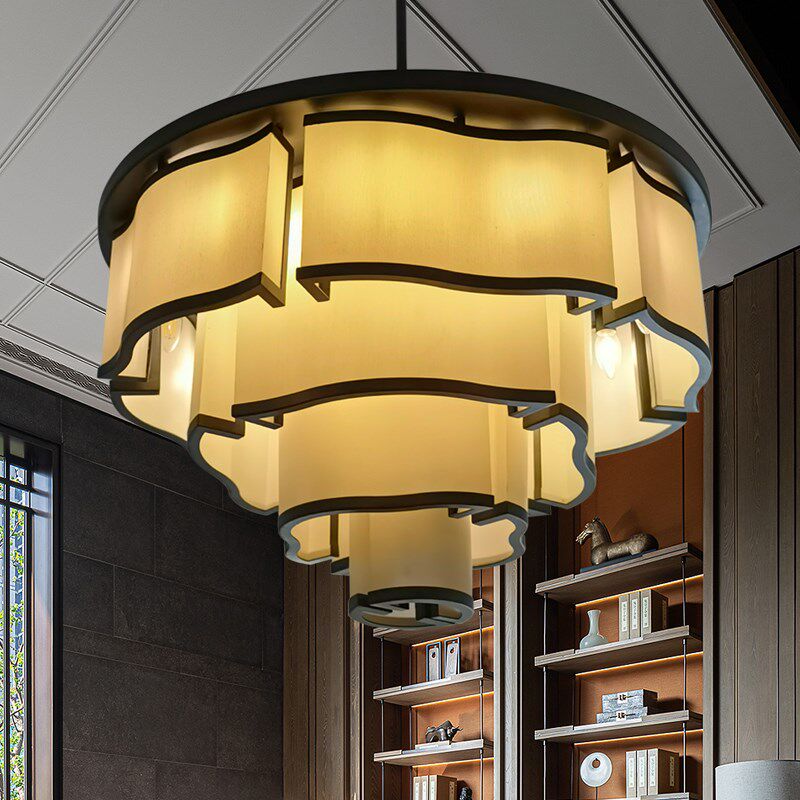 饭店包厢餐桌灯圆形复古布艺灯酒店宴会厅餐饮灯具 餐厅吊灯新中式