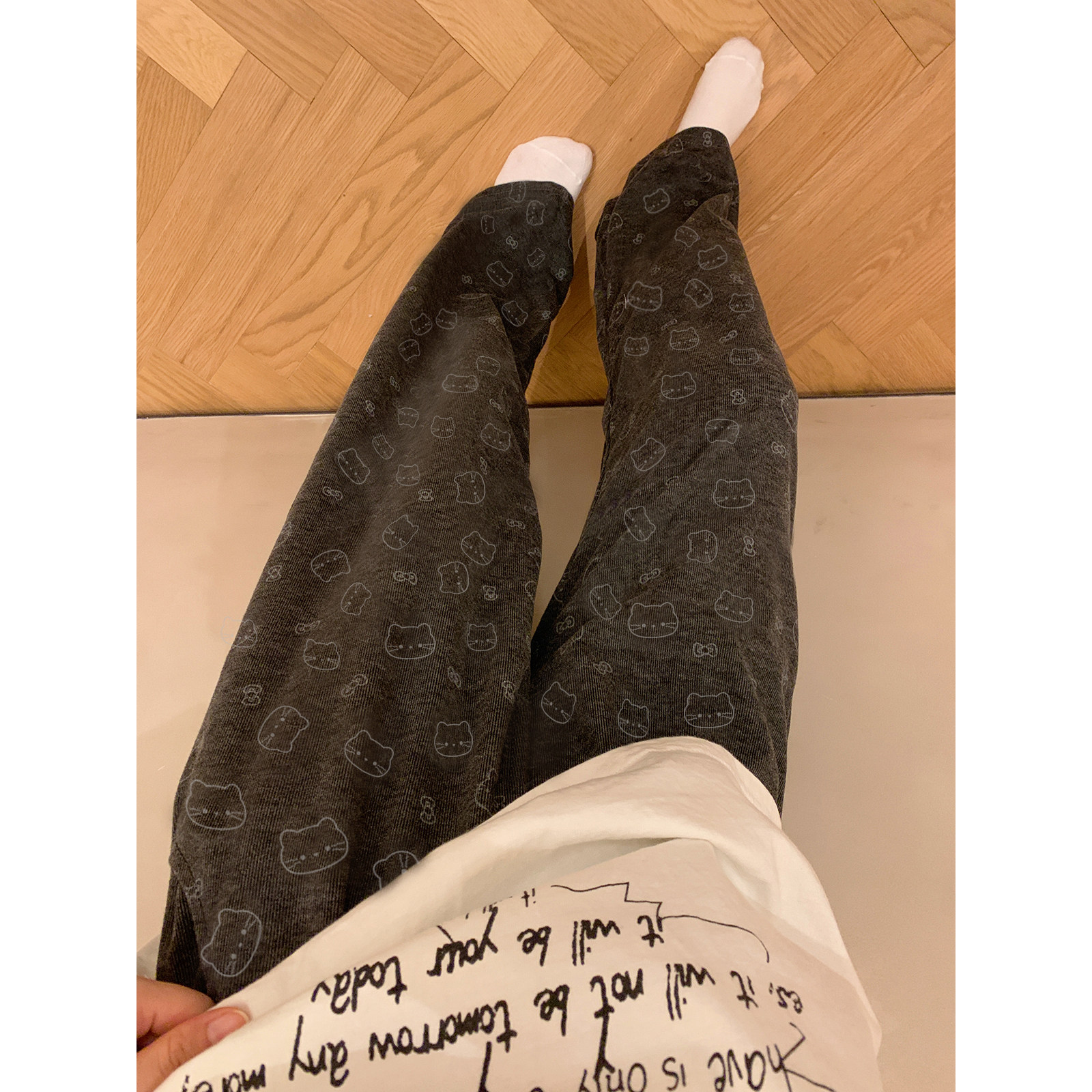 女秋冬休闲垂感宽松直筒家居裤 子 可爱卡通猫睡裤 馨帮帮Homedress