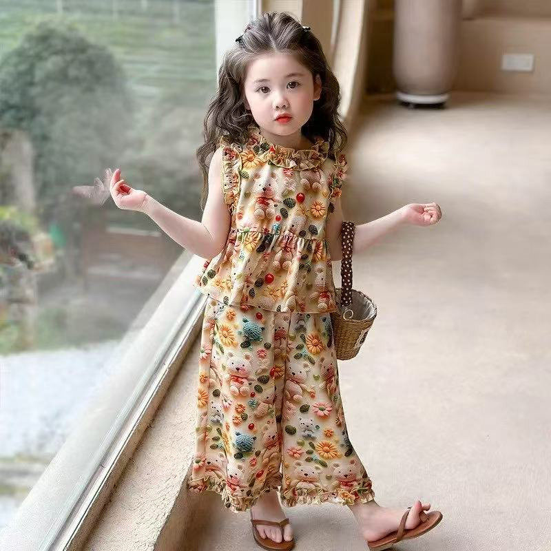 新宝宝棉绸儿童洋气小女孩薄款 女童防蚊裤 夏季 套装 两件套 夏装
